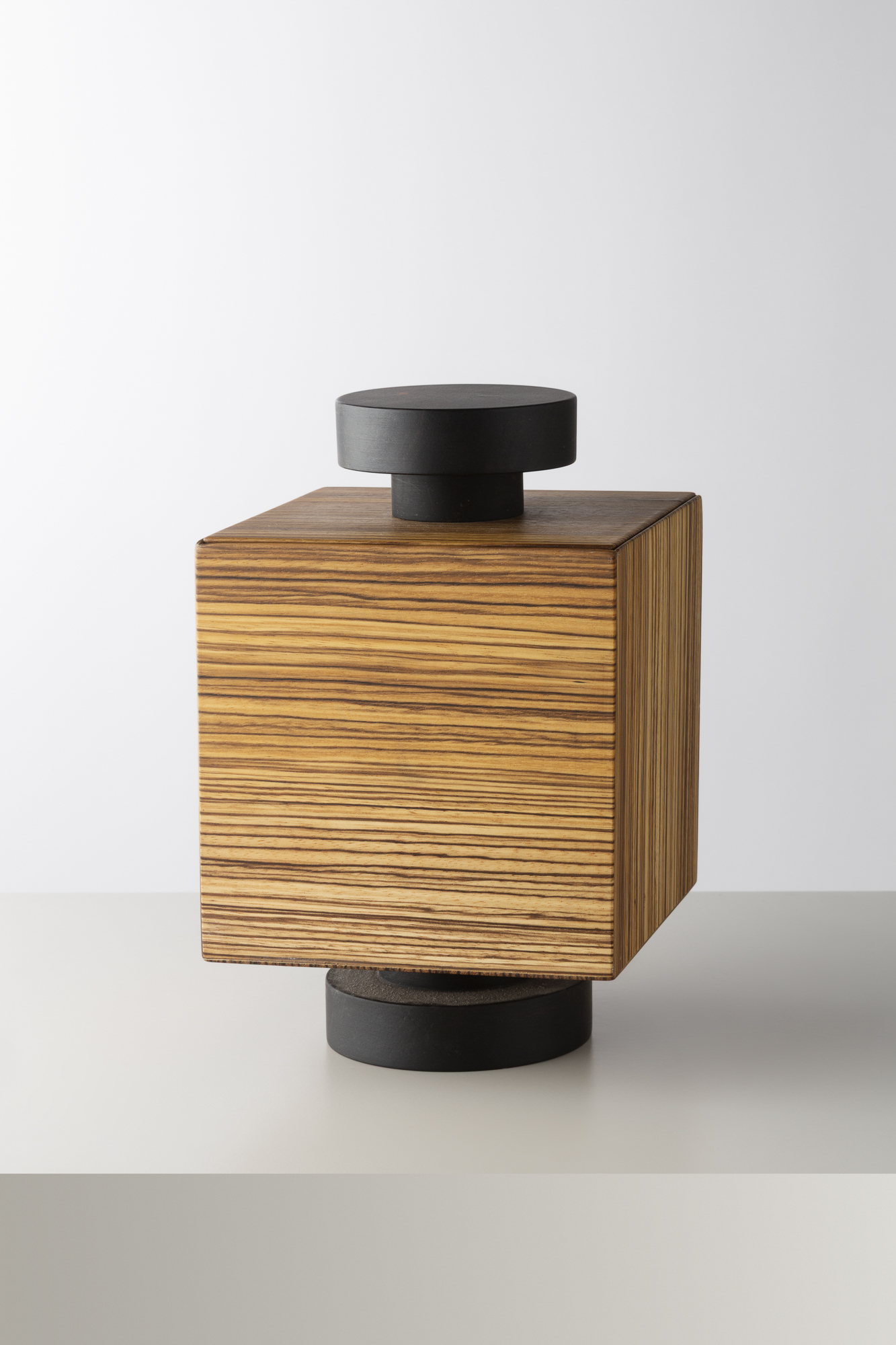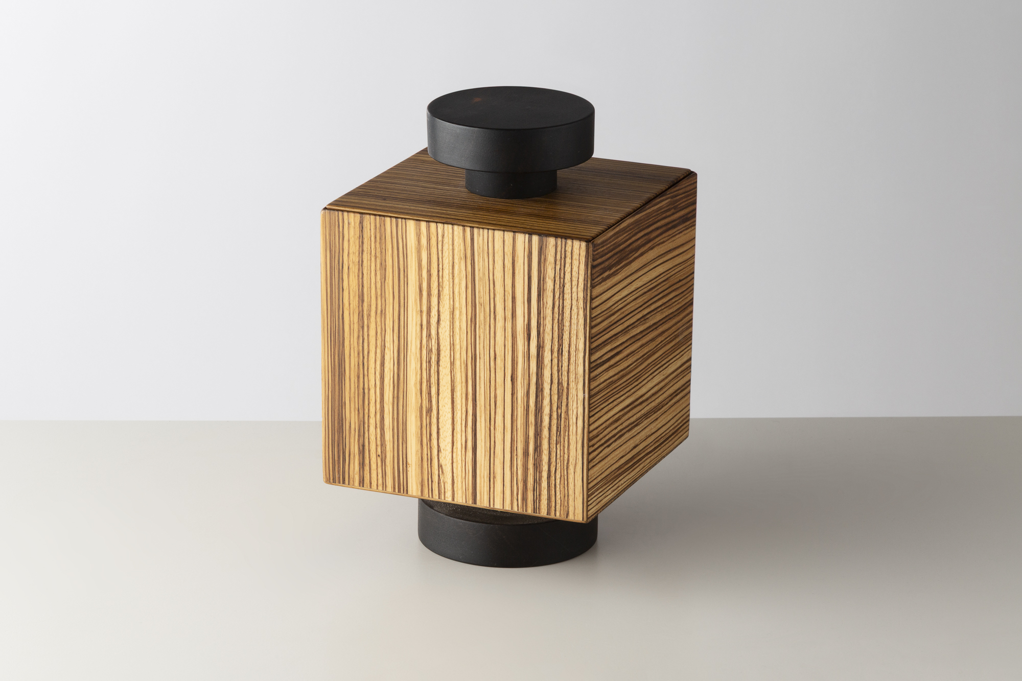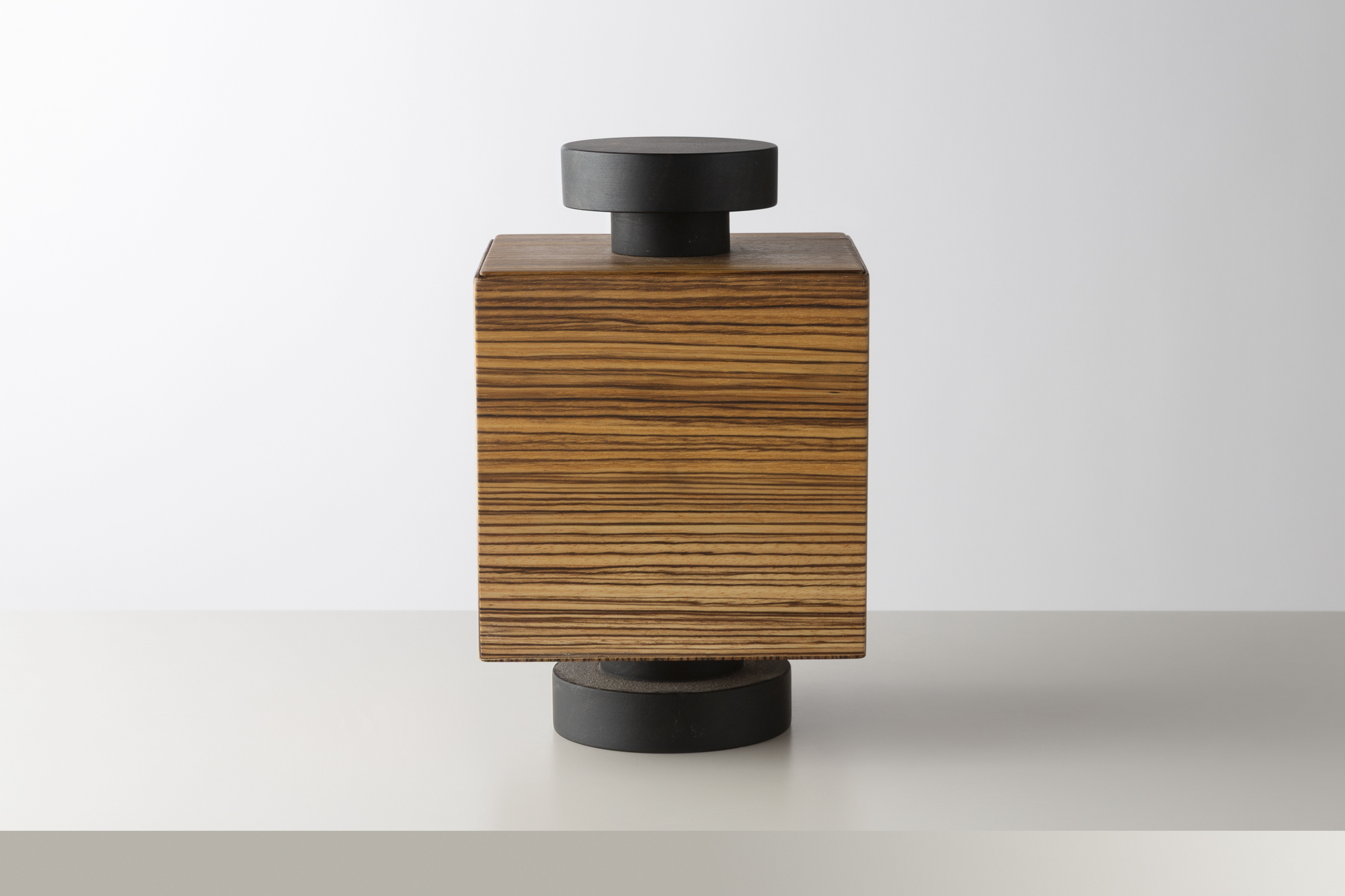 Boîte sculpturale d’Ettore Sottsass, alliant un volume rectangulaire en bois zébré à des éléments circulaires en ébène. Typique de son langage radical et poétique, cette pièce mêle géométrie, matière et jeu de contrastes, affirmant la sensibilité artistique du designer italien.