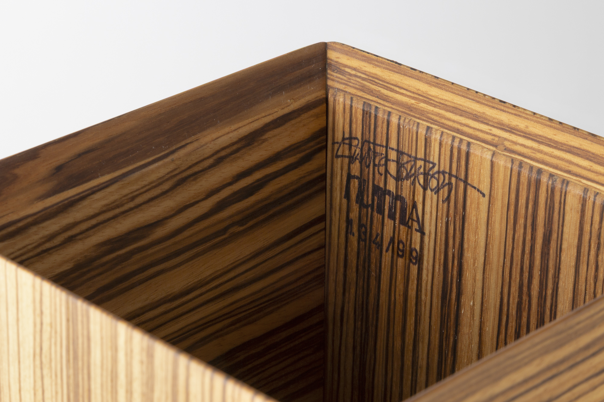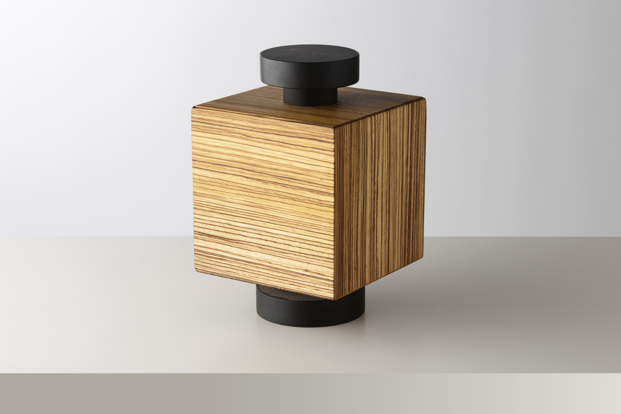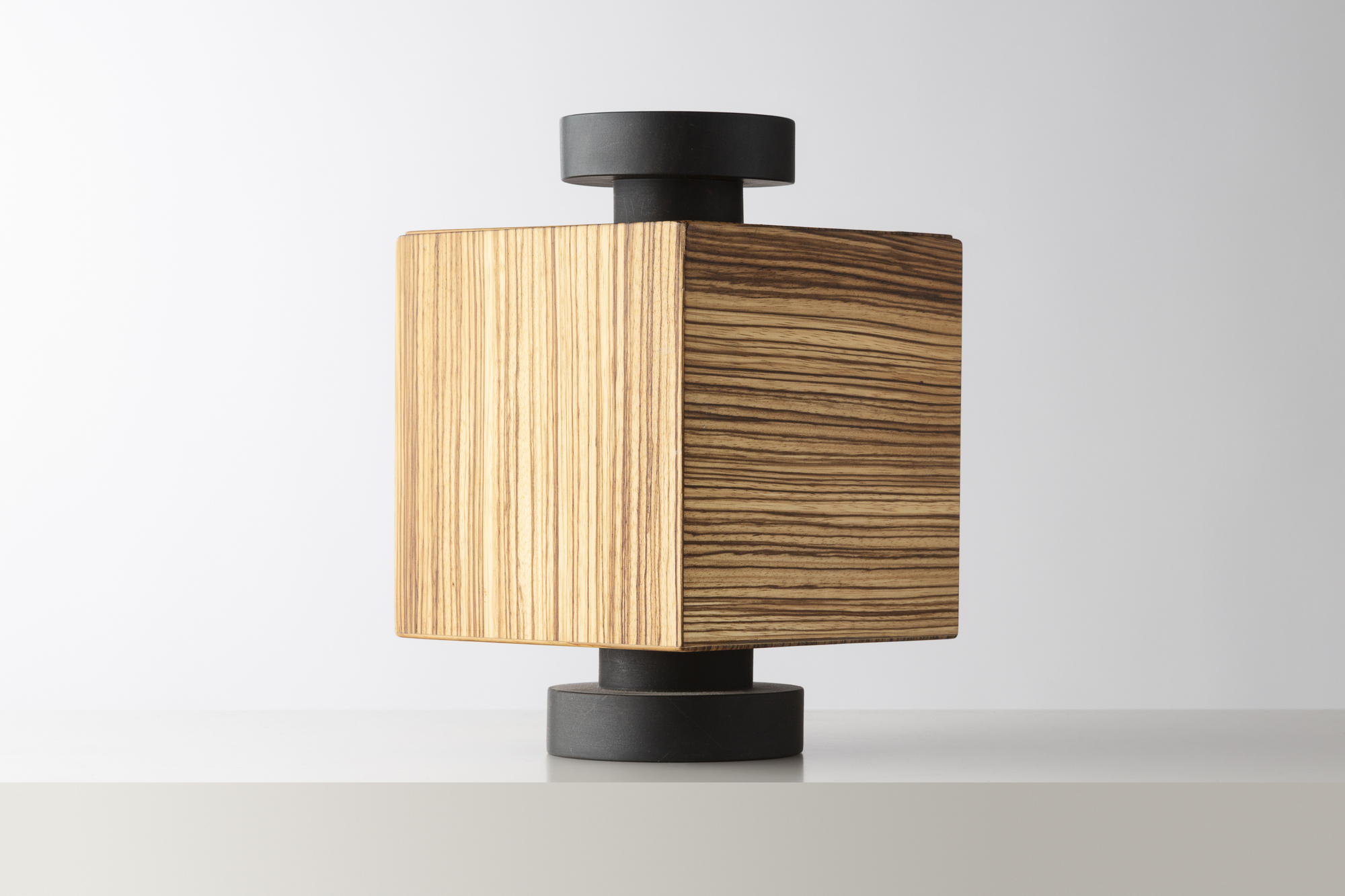 Boîte sculpturale d’Ettore Sottsass, alliant un volume rectangulaire en bois zébré à des éléments circulaires en ébène. Typique de son langage radical et poétique, cette pièce mêle géométrie, matière et jeu de contrastes, affirmant la sensibilité artistique du designer italien.