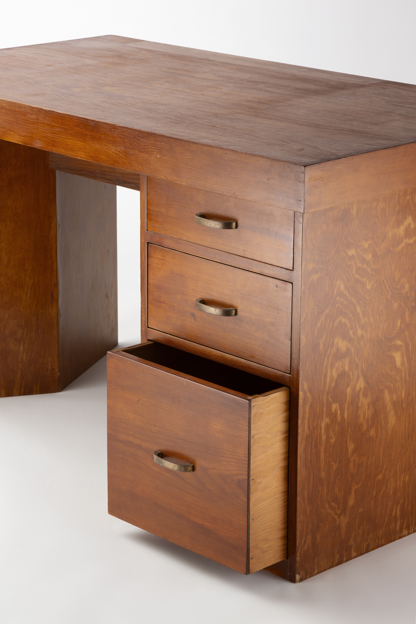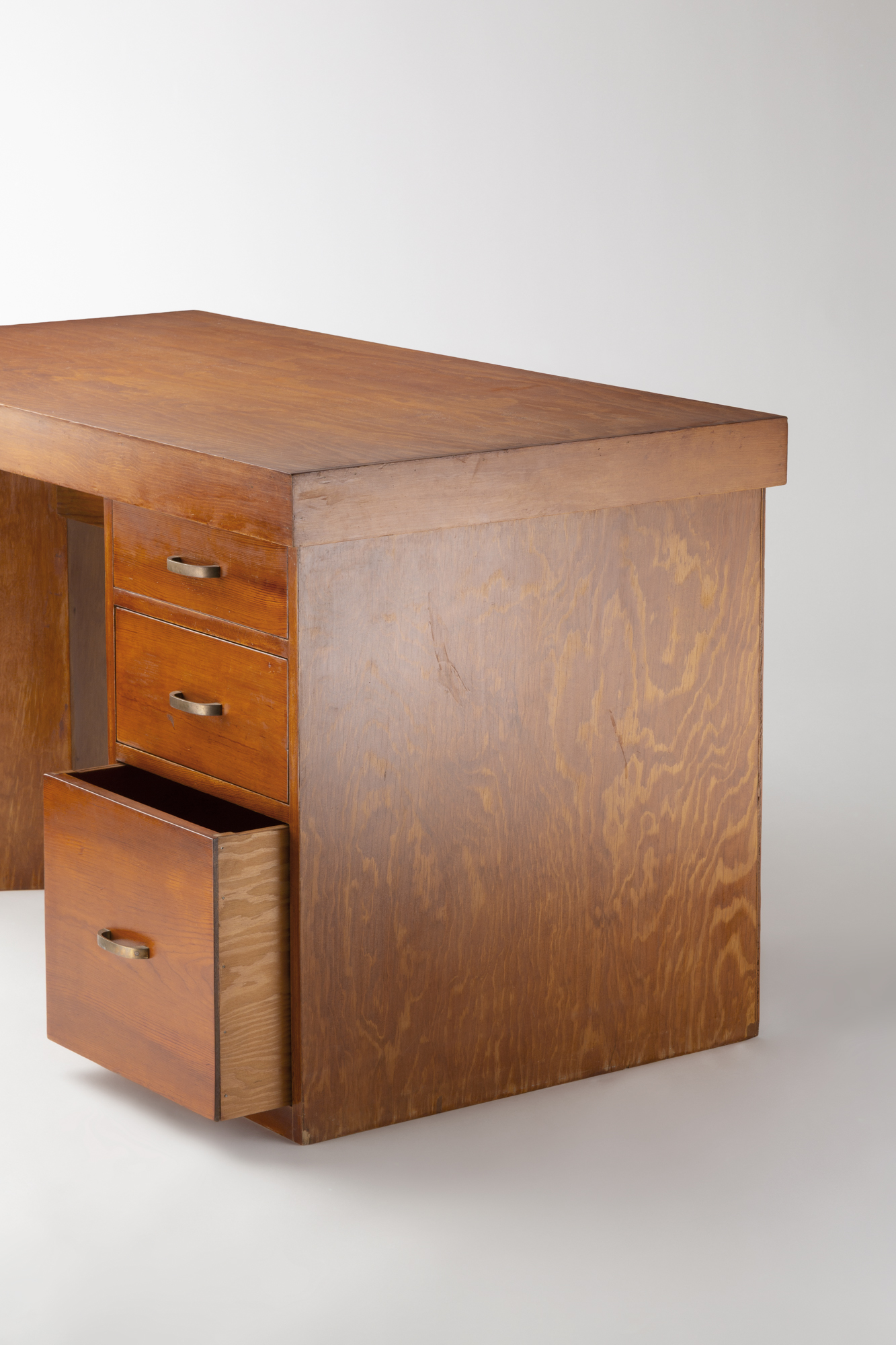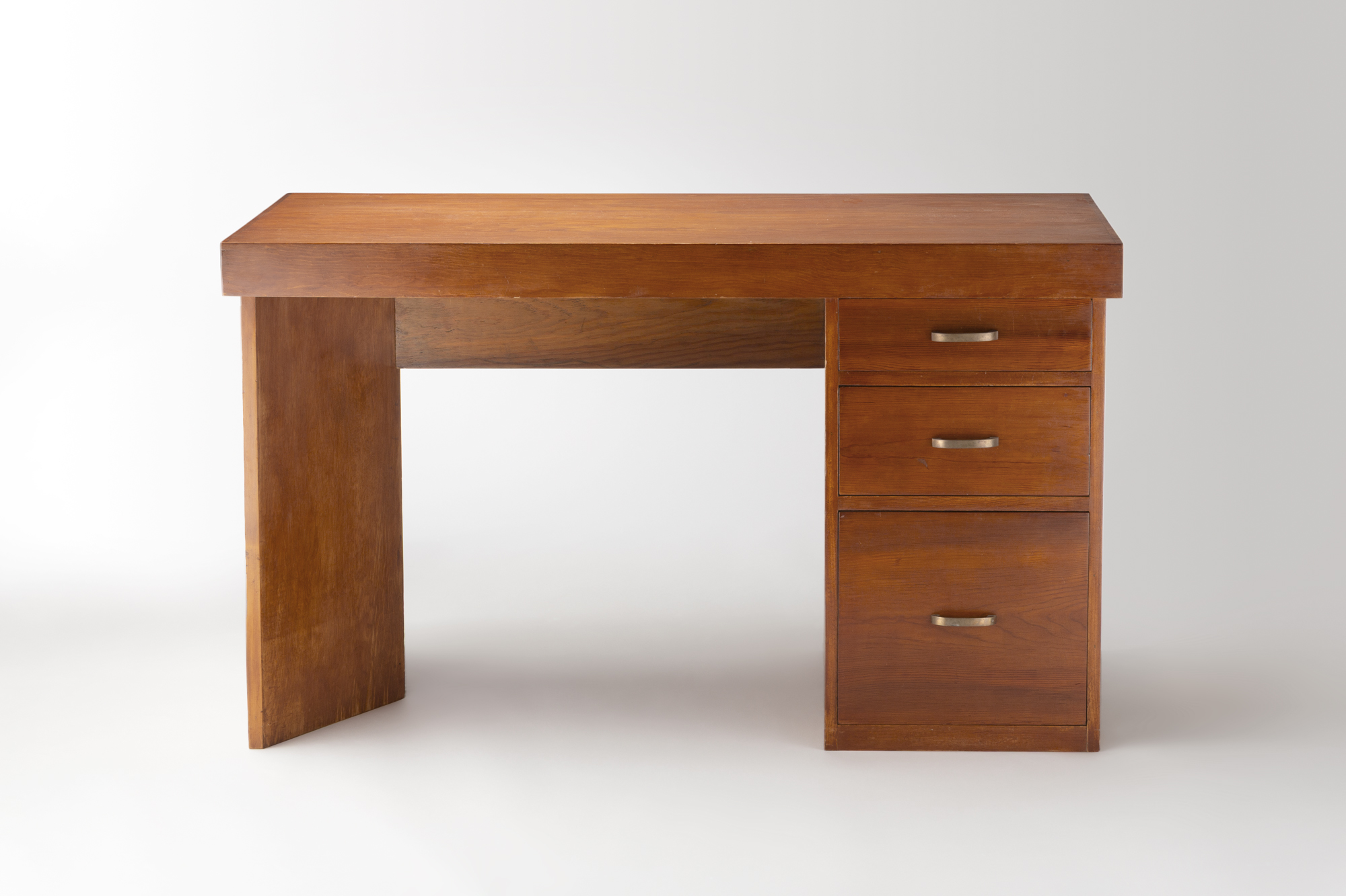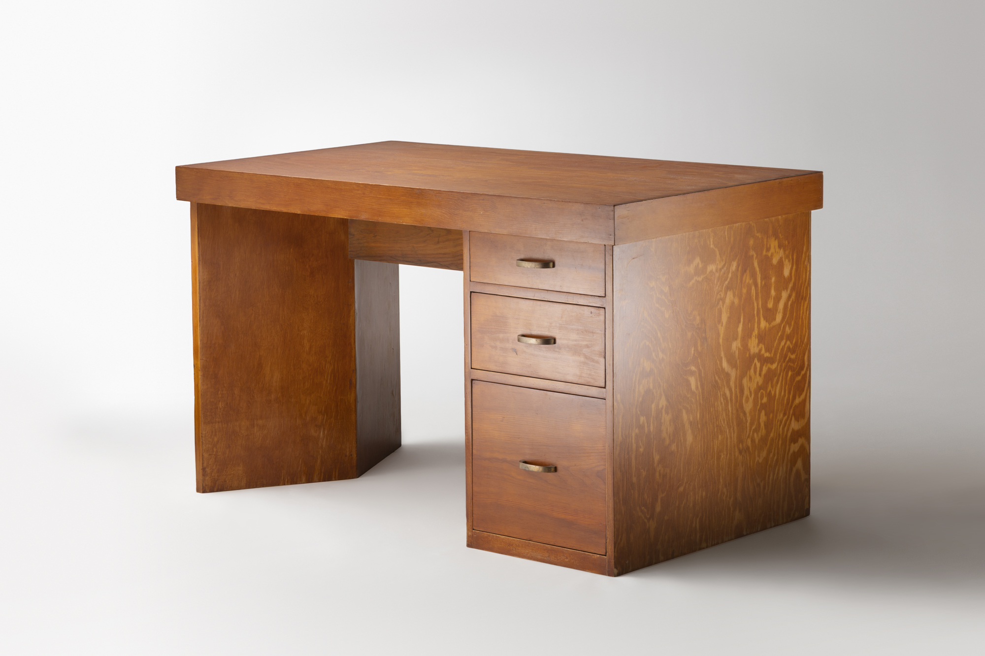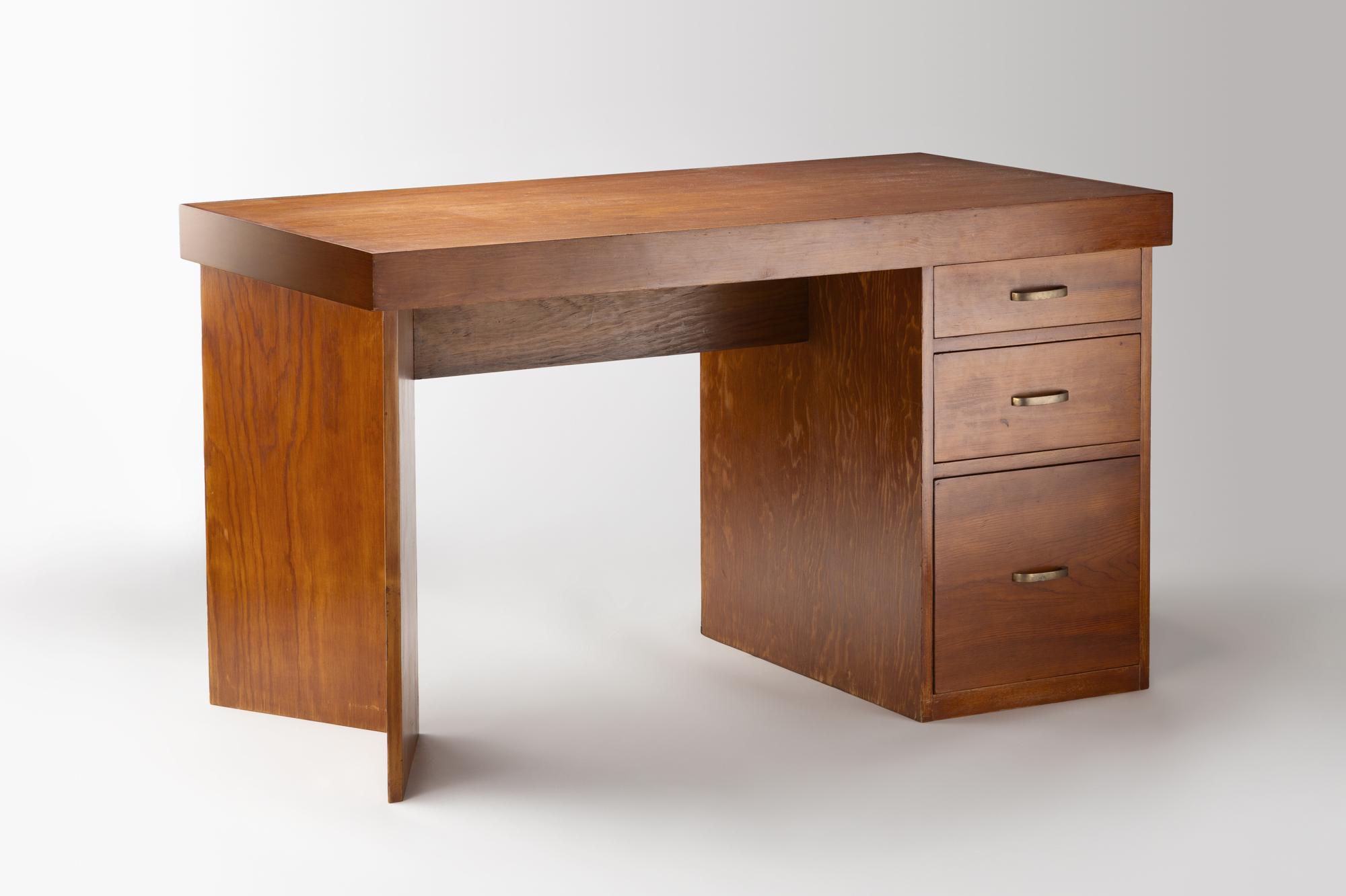 Ce bureau en bois conçu en 1951 par Frank Lloyd Wright, illustre sa vision organique du mobilier : lignes épurées, volumes géométriques et fonctionnalité intégrée. Doté d’un caisson à tiroirs asymétrique, il reflète l’esthétique sobre et architecturale propre aux aménagements intérieurs du maître américain.