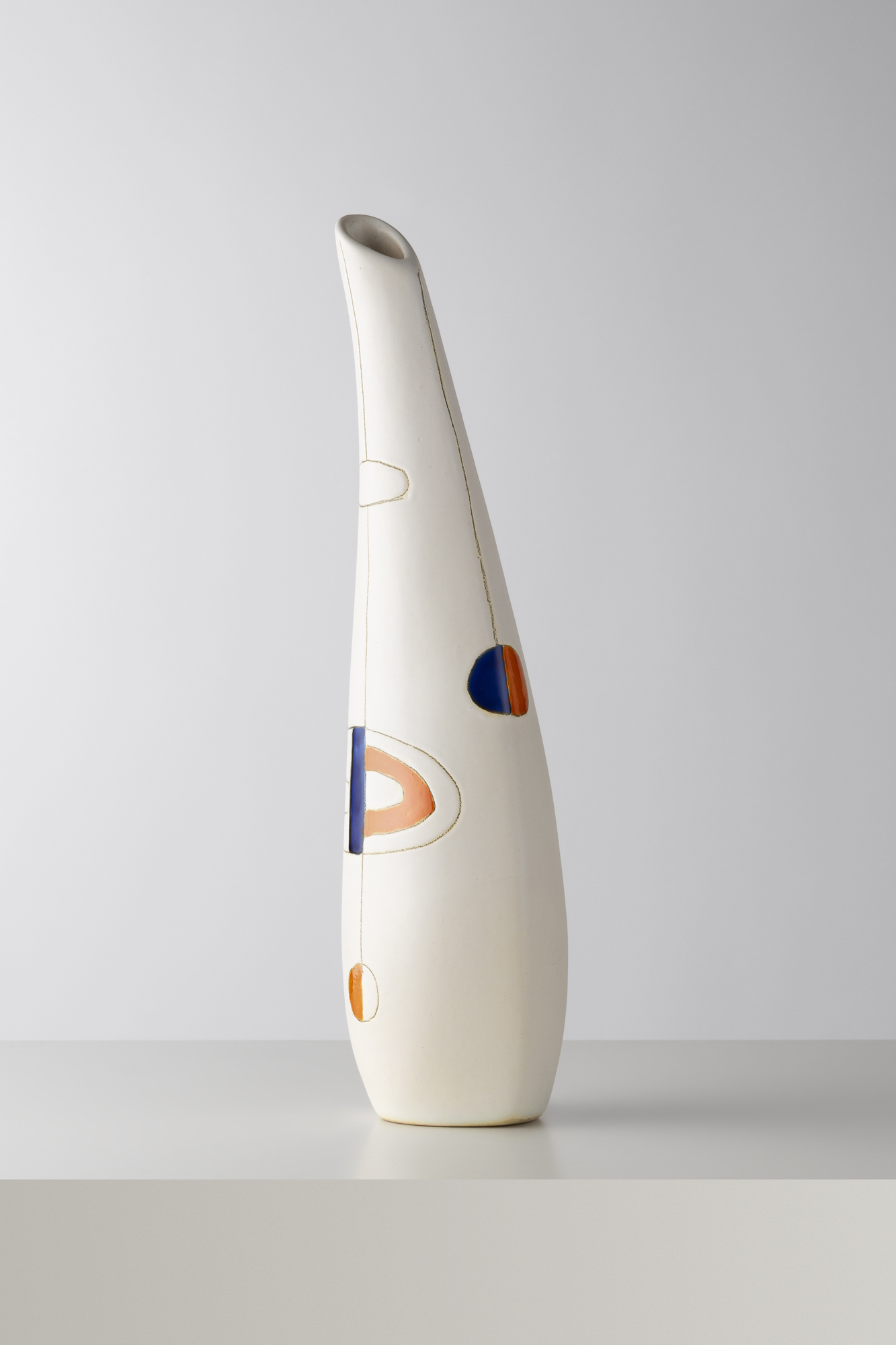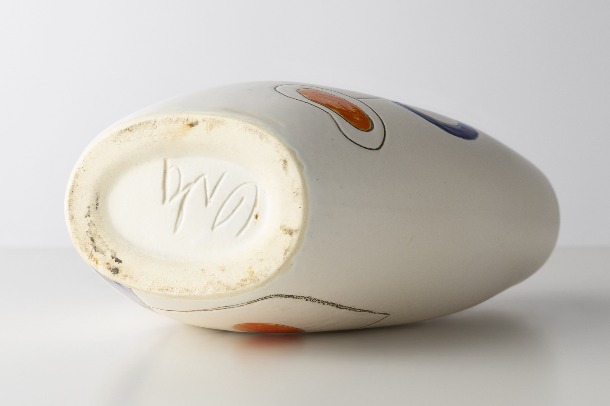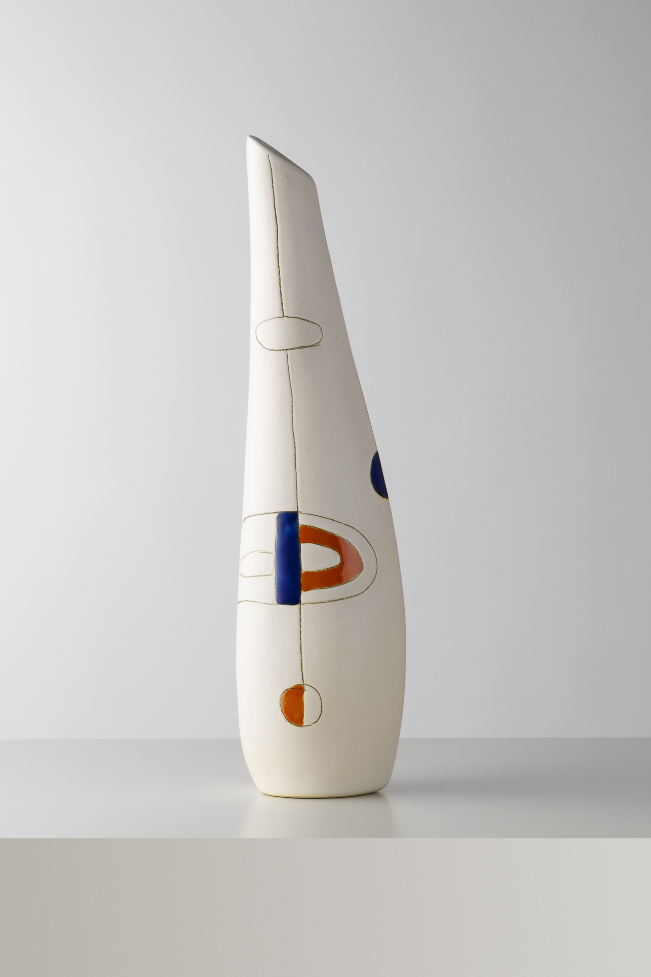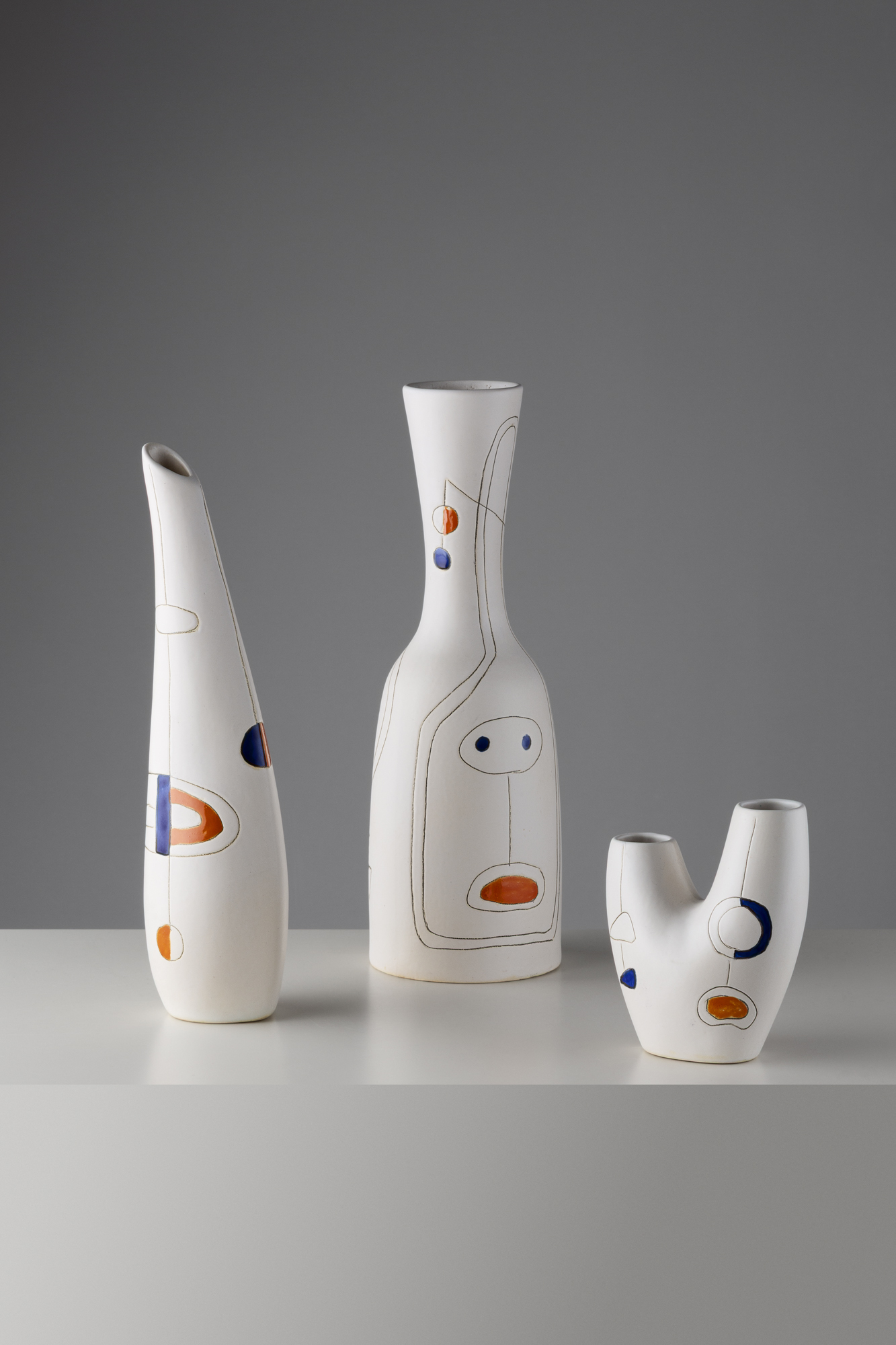 Cet ensemble de trois vases de Peter et Denise Orlando révèle toute la poésie moderniste du duo : silhouettes sculpturales, lignes et décors abstraits aux accents bleu profond et orange lumineux. Chaque pièce, unique dans sa forme comme dans son graphisme, compose un ensemble cohérent et expressif, emblématique de leur langage céramique intemporel.