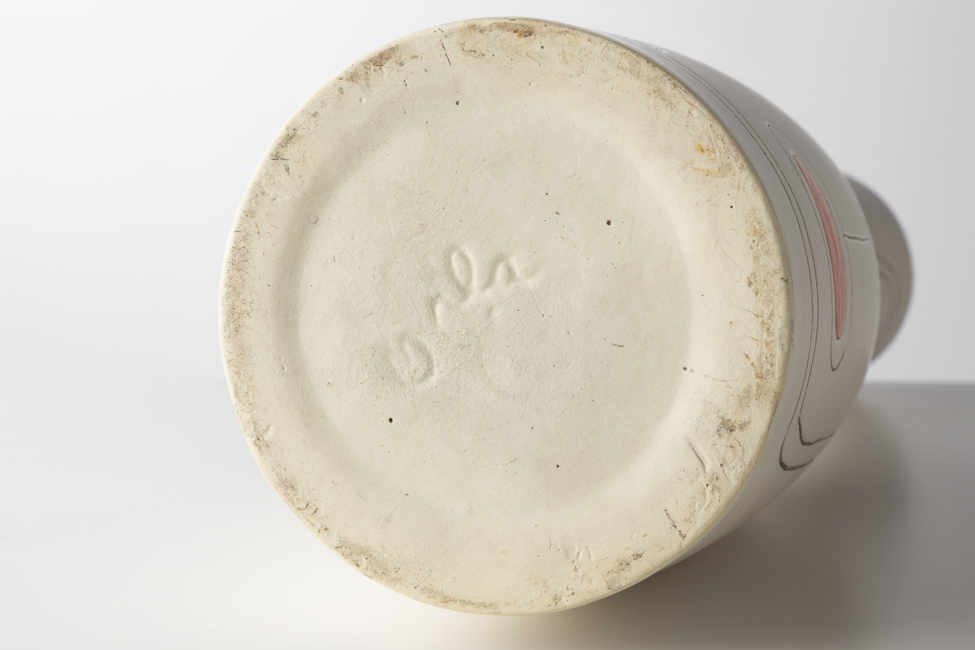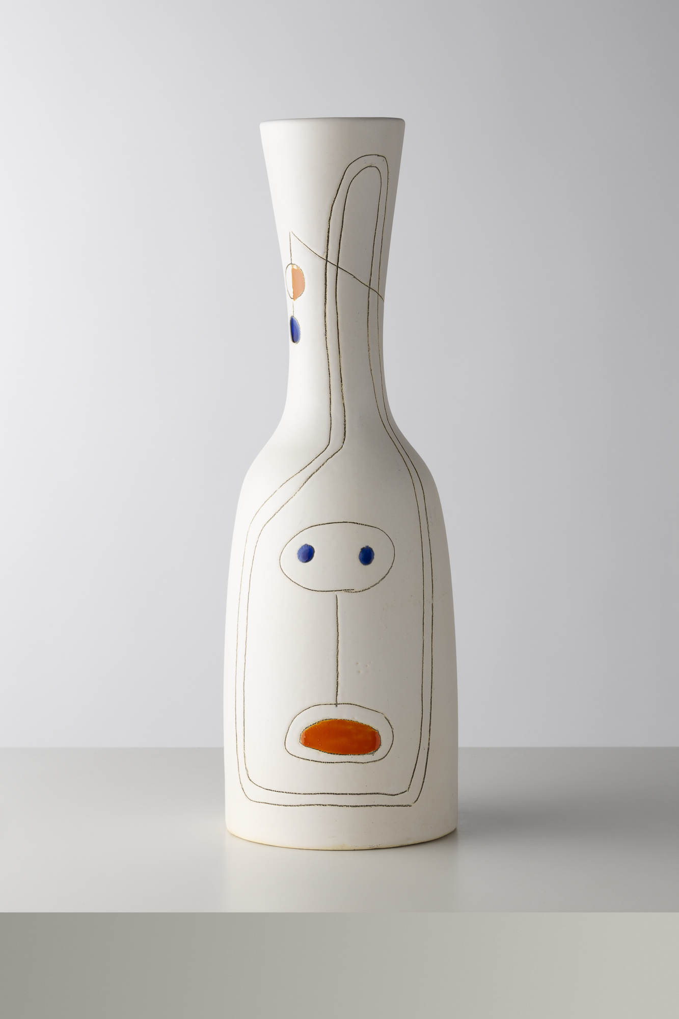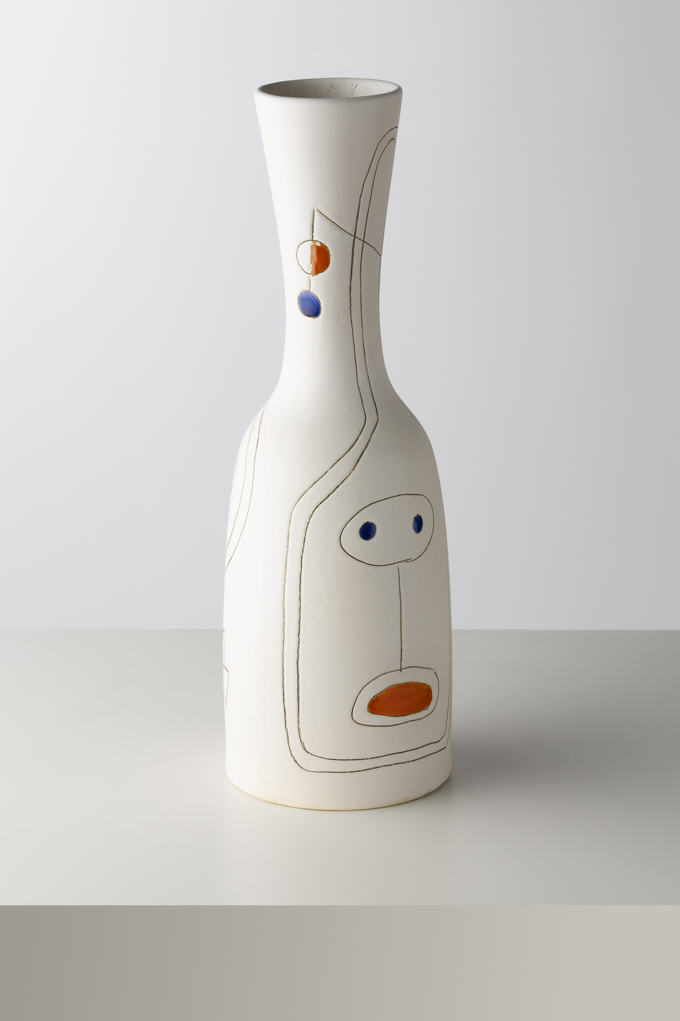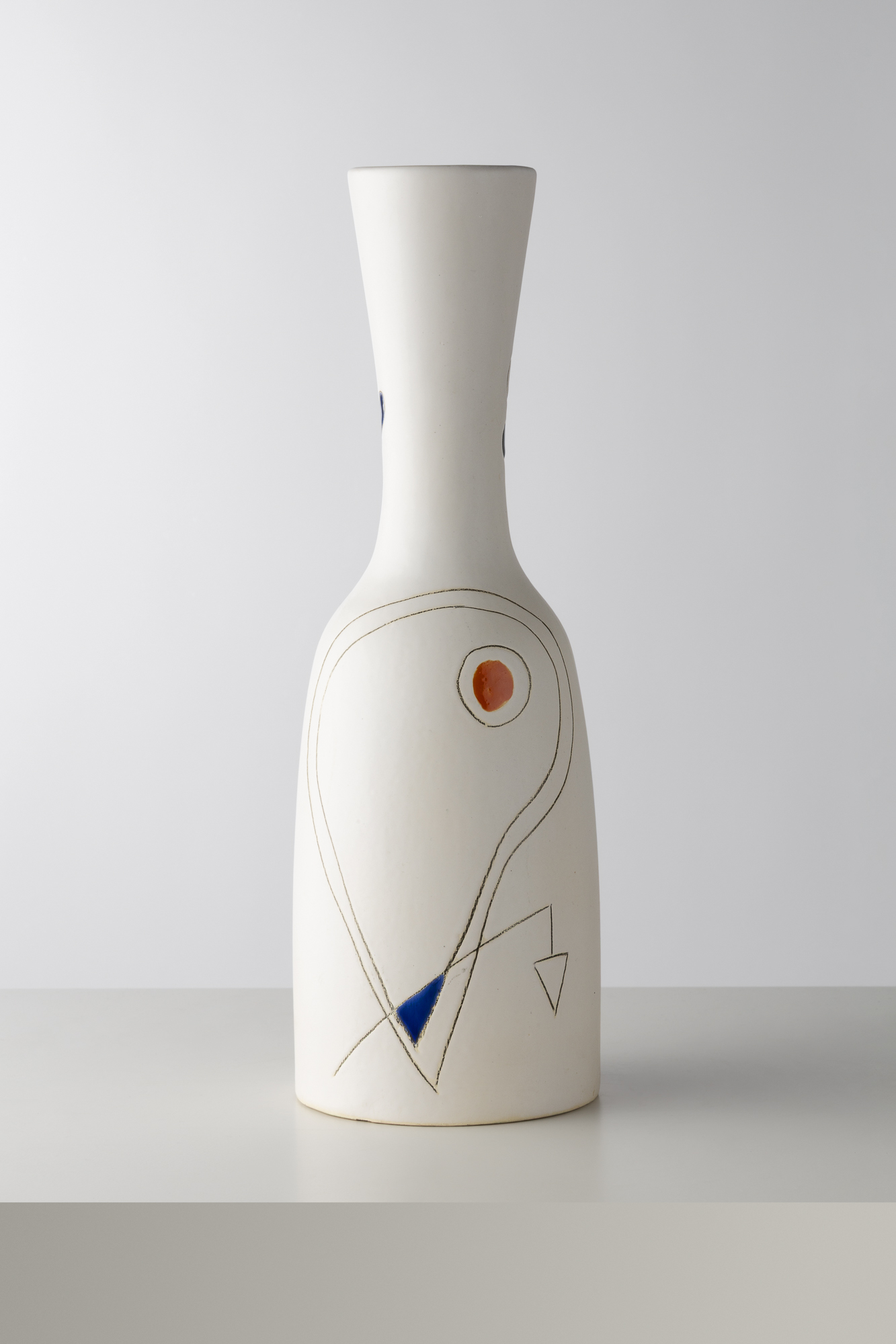 Cet ensemble de trois vases de Peter et Denise Orlando révèle toute la poésie moderniste du duo : silhouettes sculpturales, lignes et décors abstraits aux accents bleu profond et orange lumineux. Chaque pièce, unique dans sa forme comme dans son graphisme, compose un ensemble cohérent et expressif, emblématique de leur langage céramique intemporel.