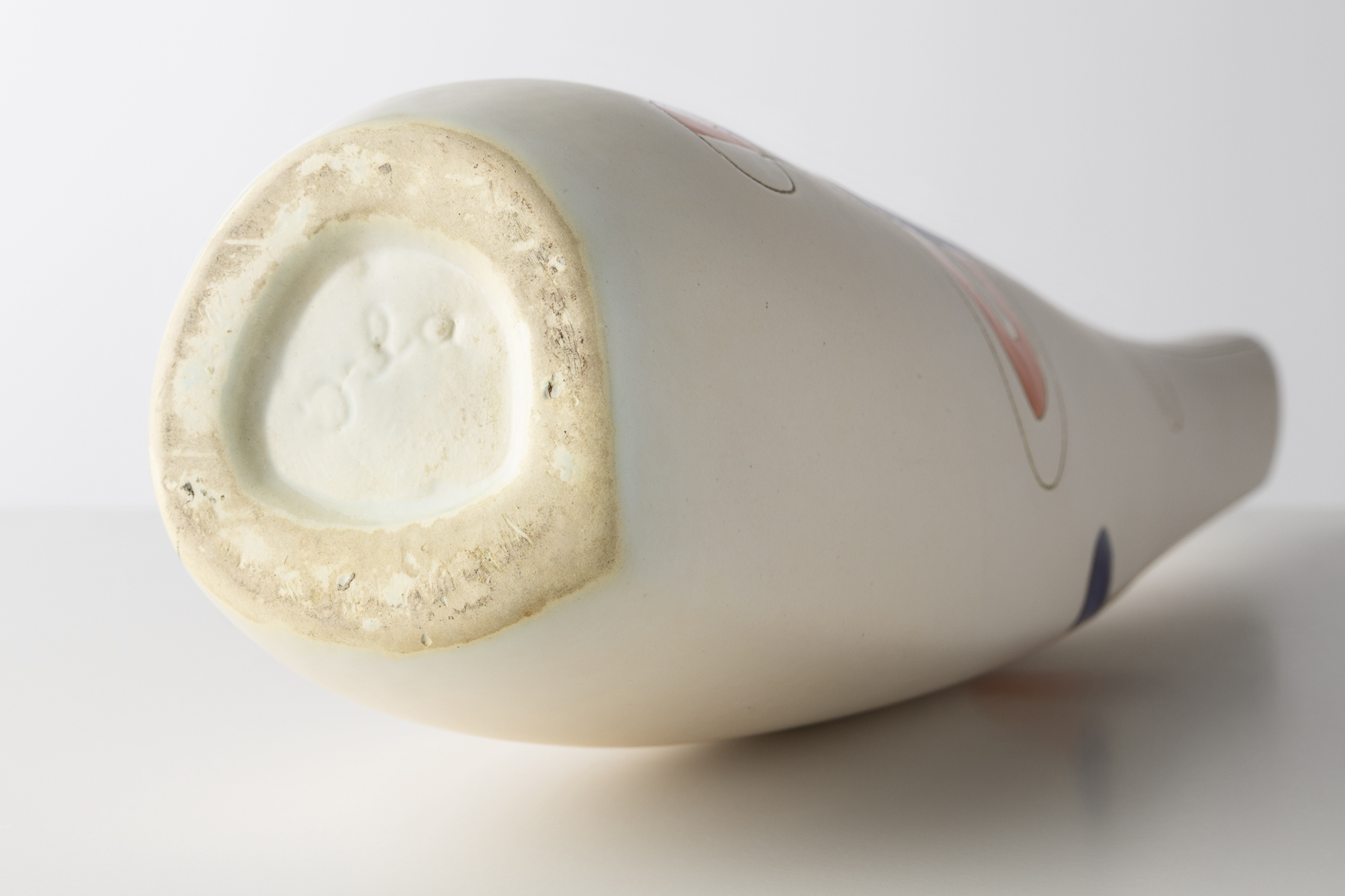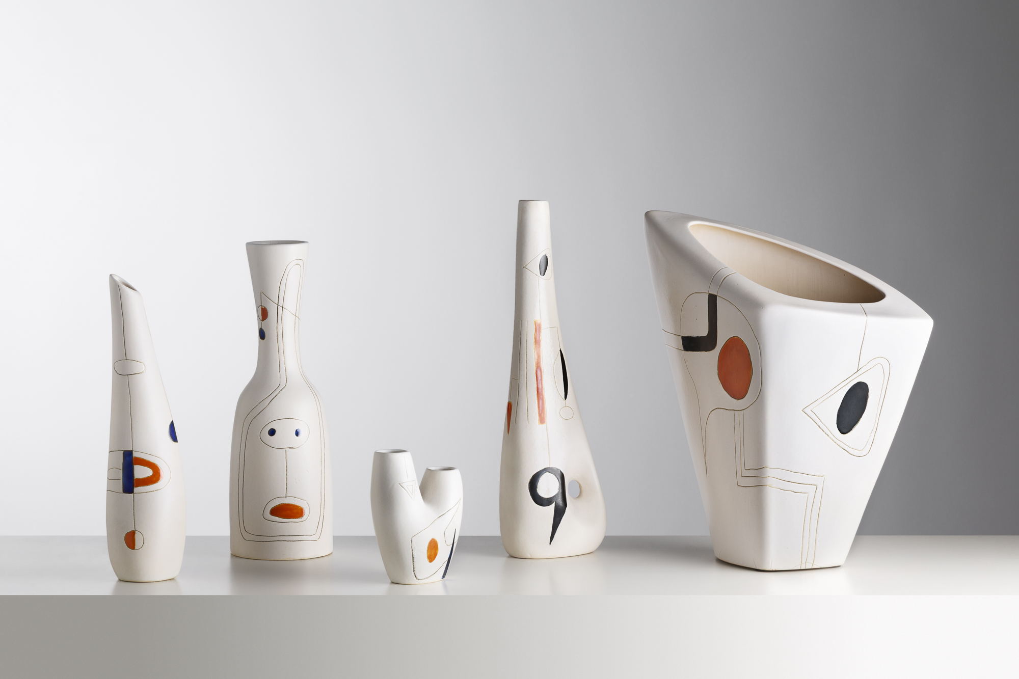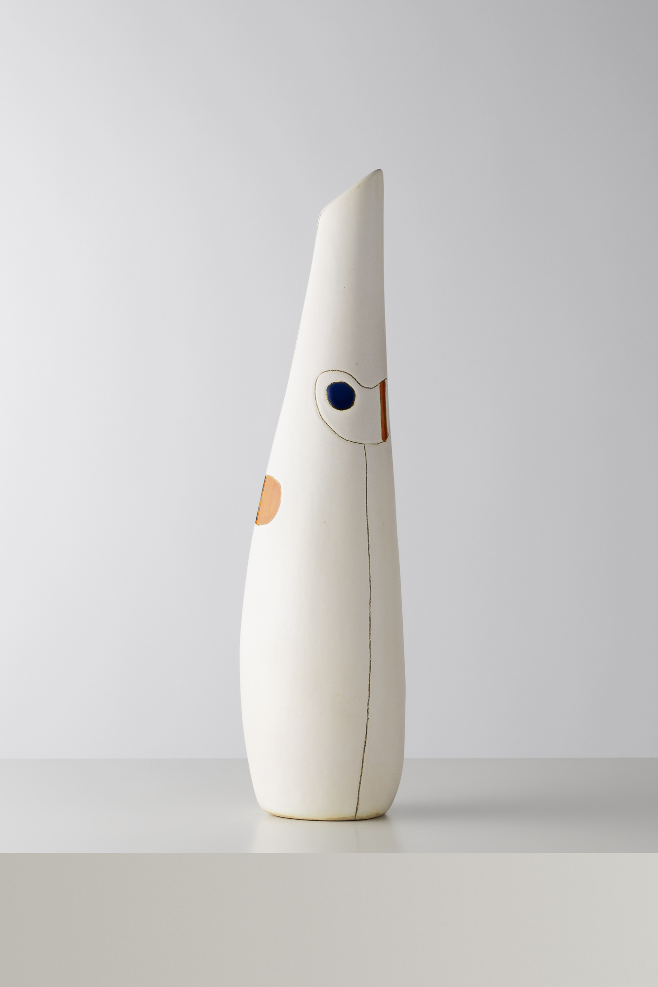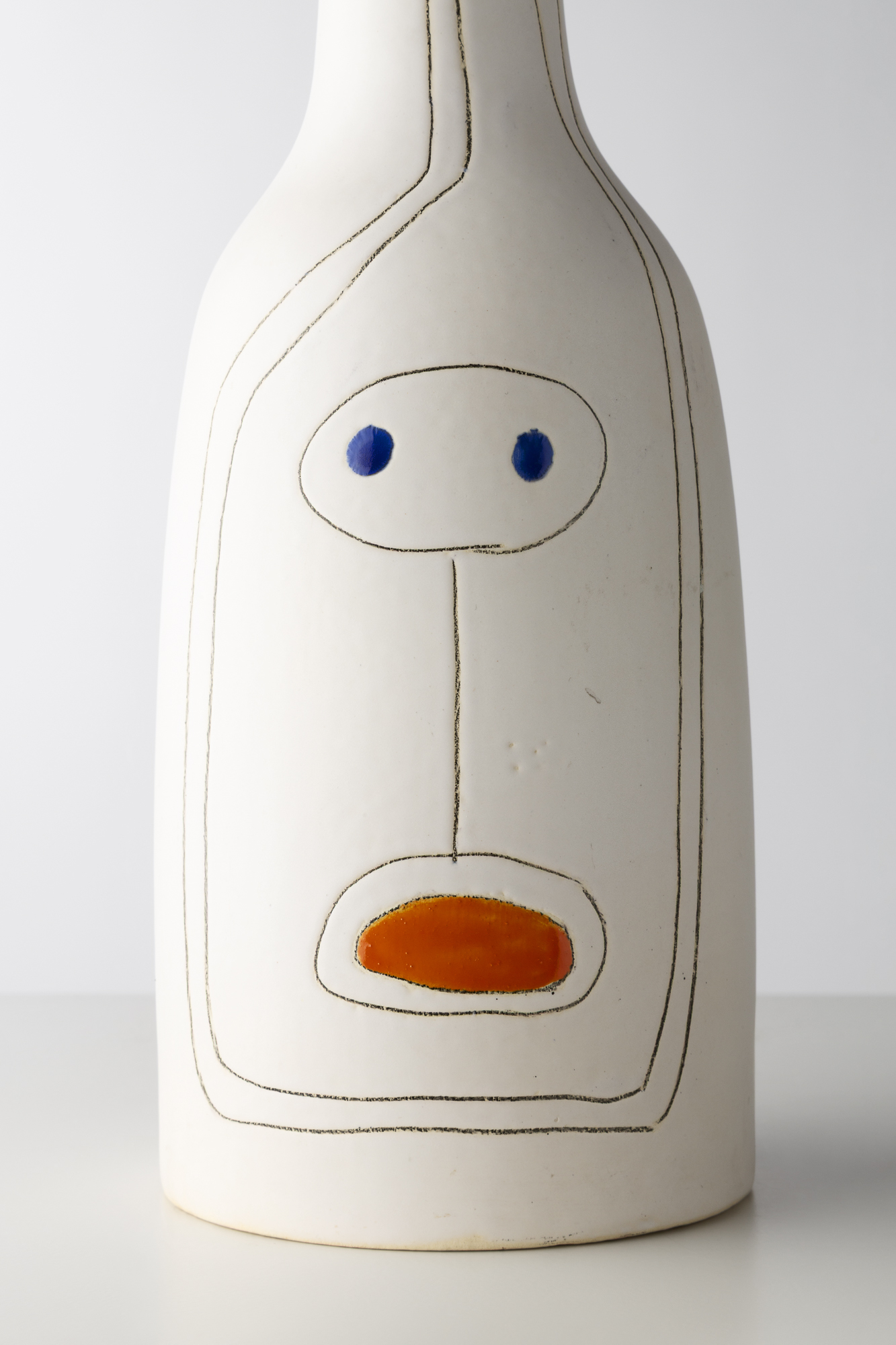 Cet ensemble de trois vases de Peter et Denise Orlando révèle toute la poésie moderniste du duo : silhouettes sculpturales, lignes et décors abstraits aux accents bleu profond et orange lumineux. Chaque pièce, unique dans sa forme comme dans son graphisme, compose un ensemble cohérent et expressif, emblématique de leur langage céramique intemporel.