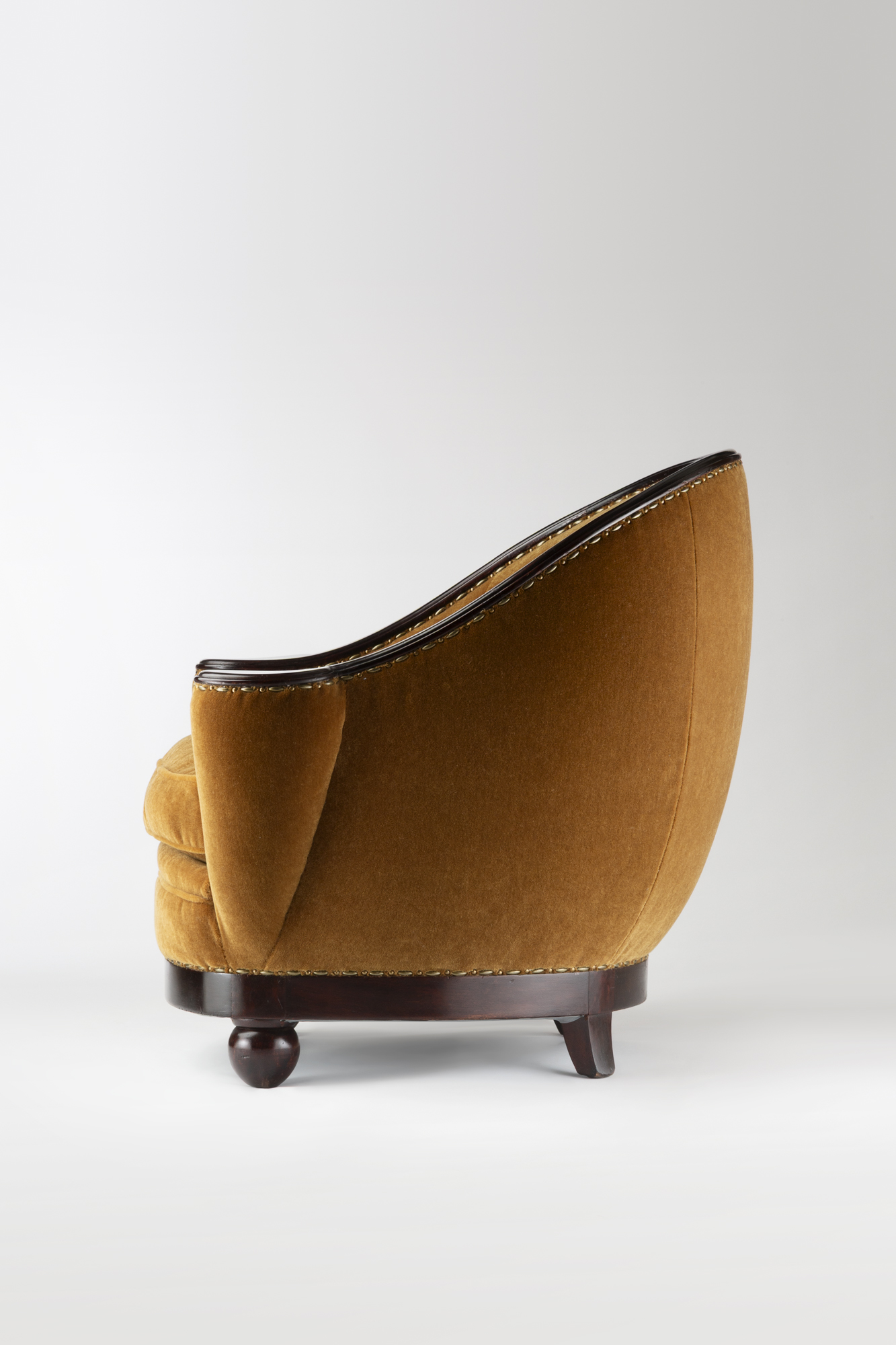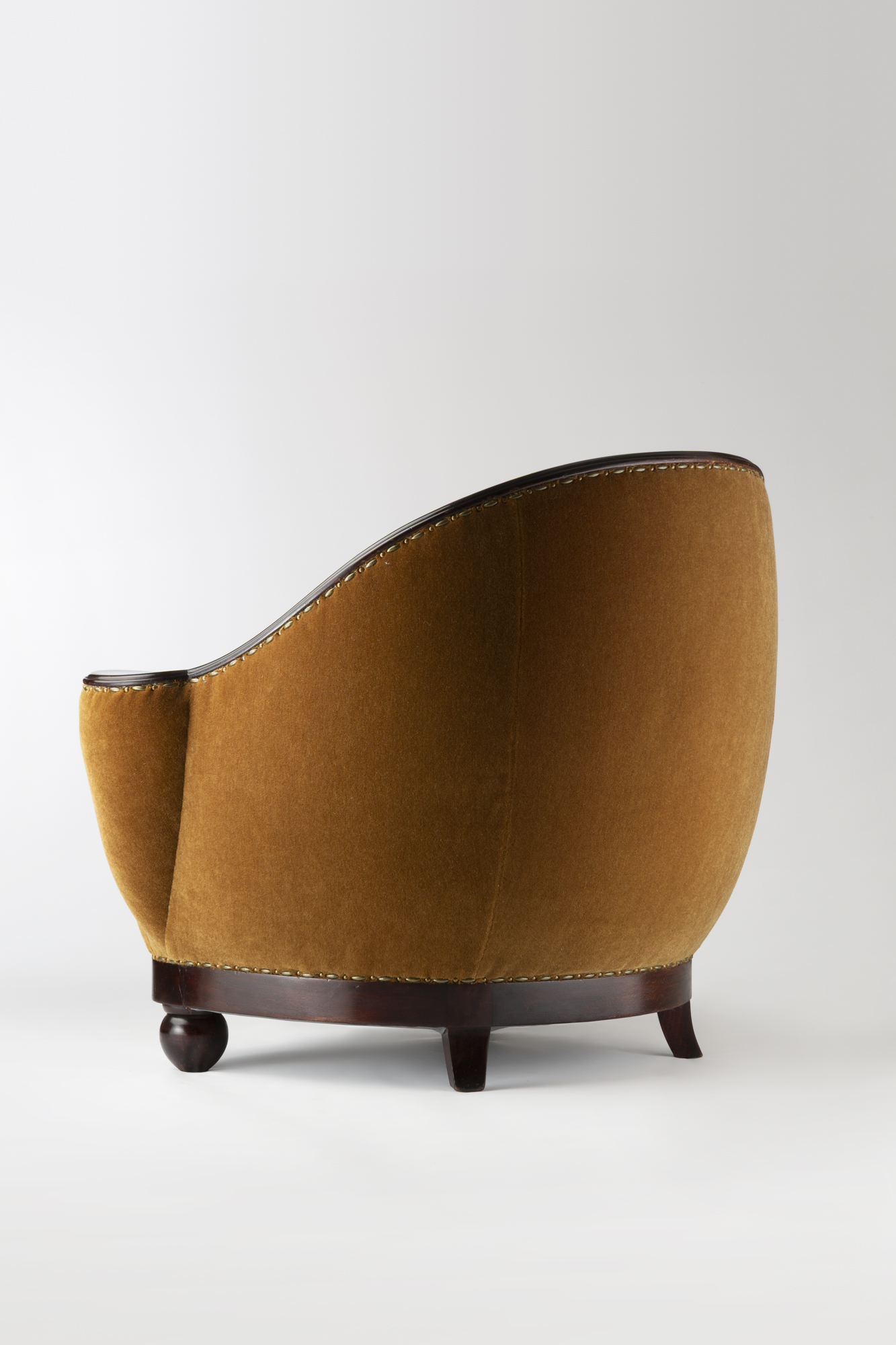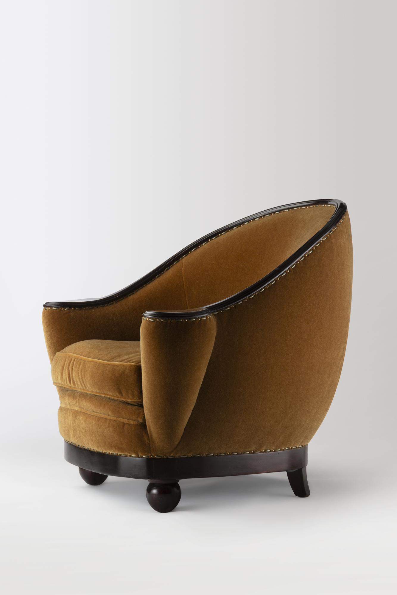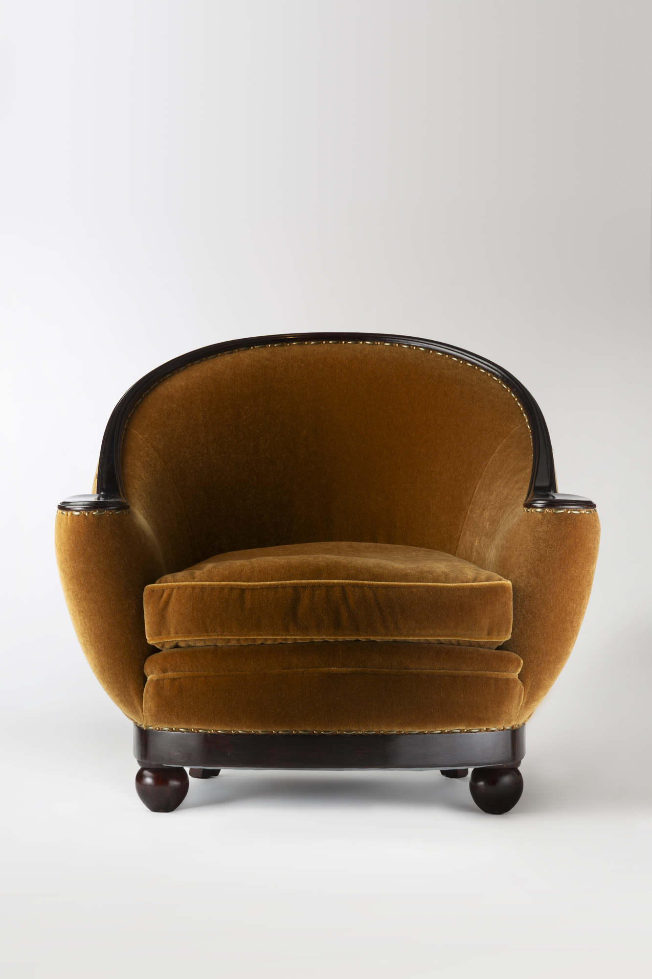Fauteuil enveloppant des années 1920, caractérisé par ses courbes douces, son velours chaleureux et sa base en bois sombre. Son élégante silhouette galbée, typique du style d’André Groult, allie raffinement décoratif et confort généreux.
