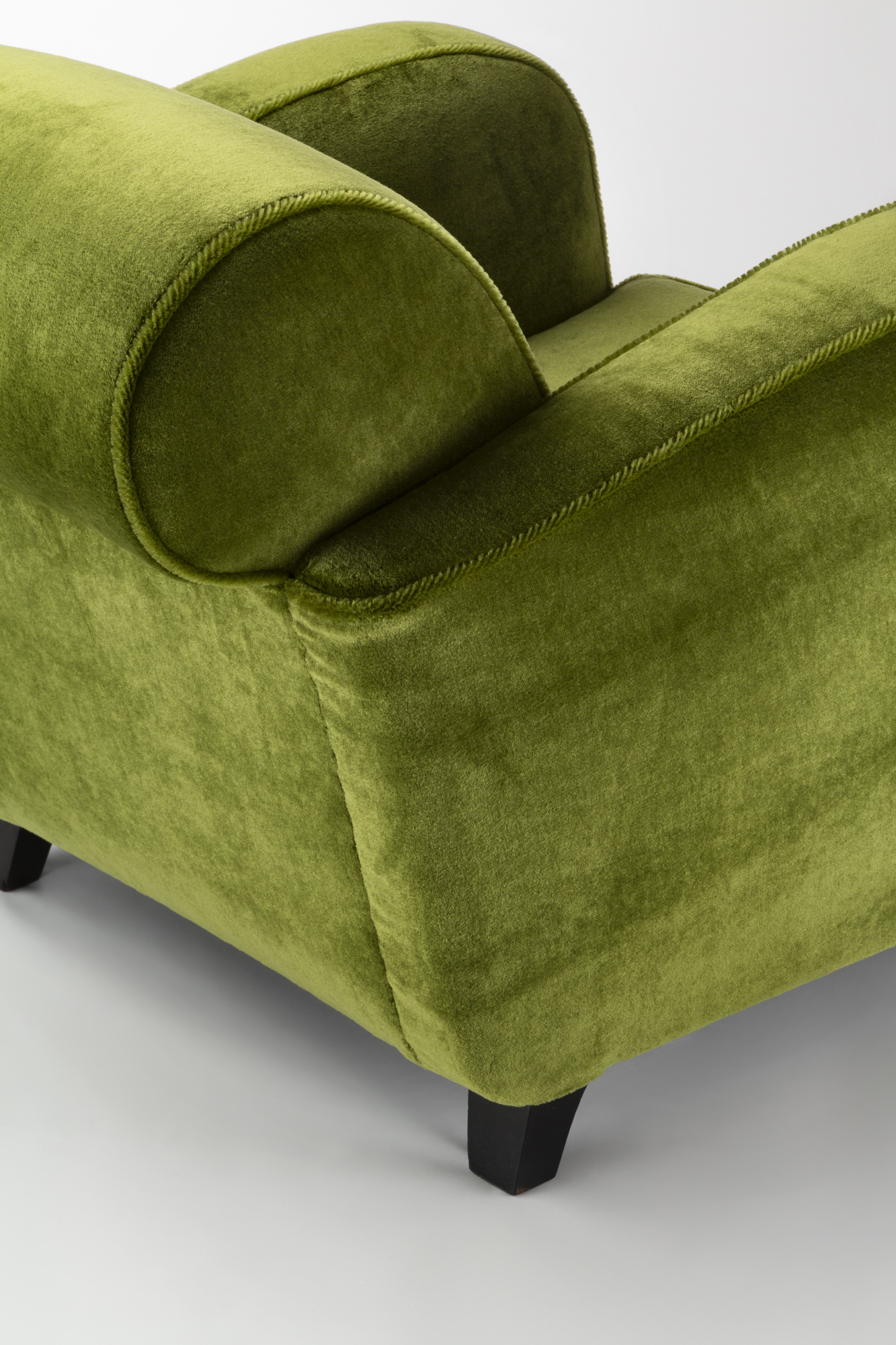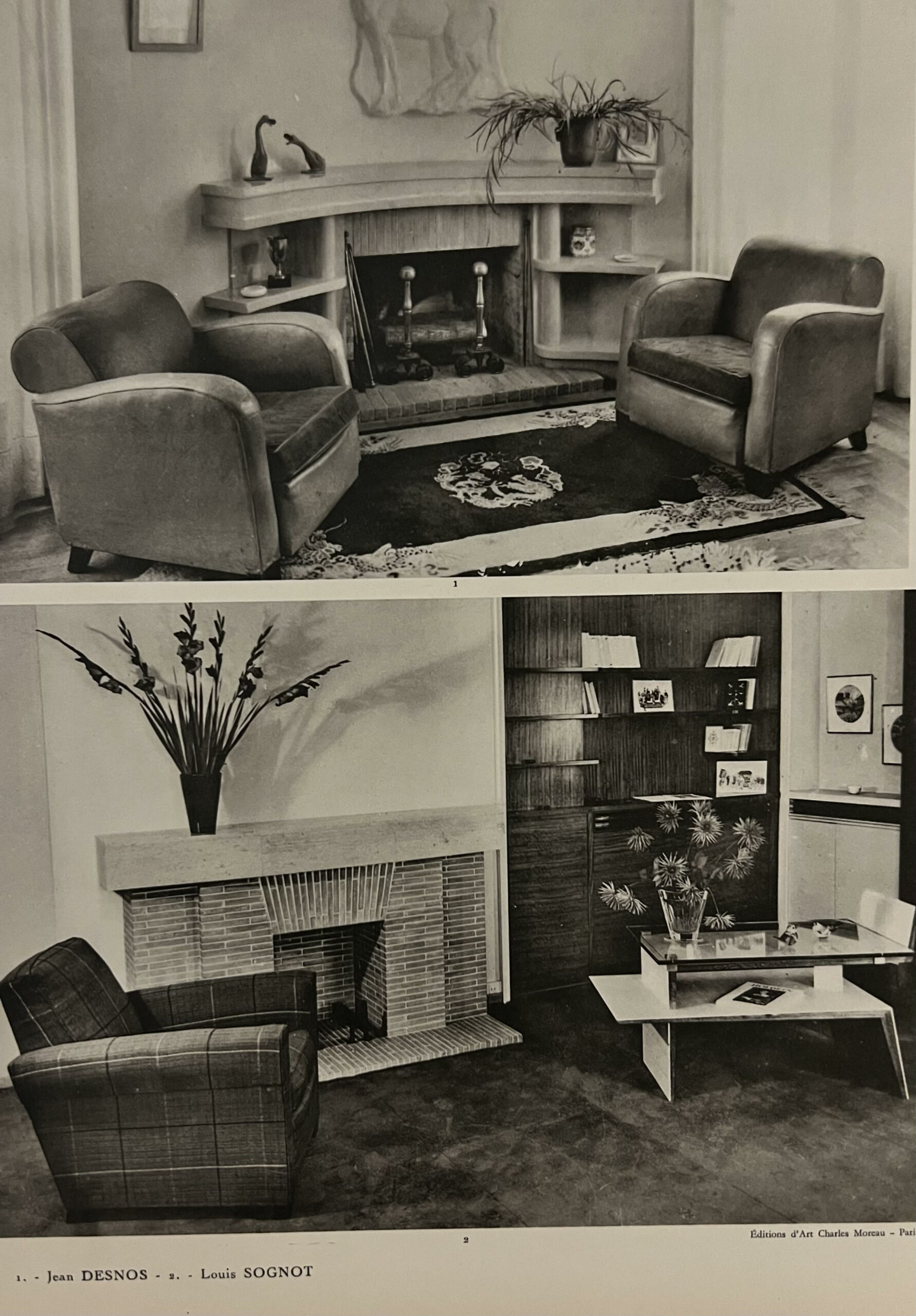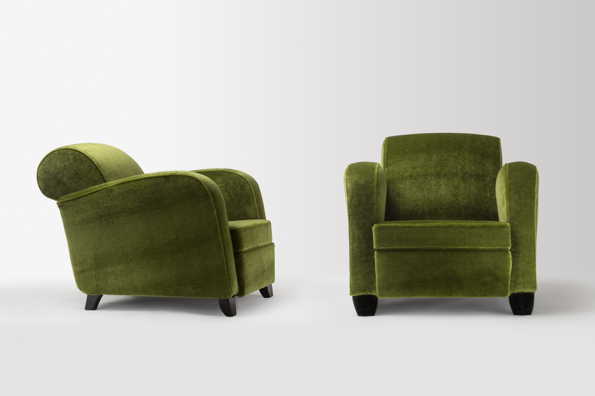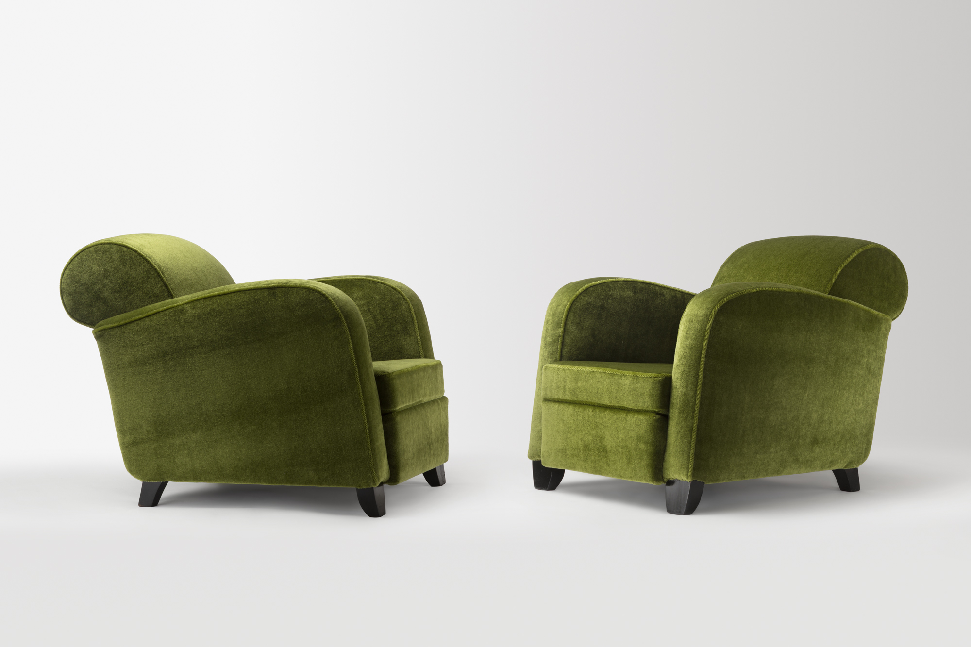 Élégante paire de fauteuils signée Jean Desnos, typique des années 1930, avec leurs lignes arrondies, leur assise généreuse et leur revêtement en velours vert. Leur silhouette enveloppante et leur confort en font des pièces raffinées emblématiques du modernisme français.