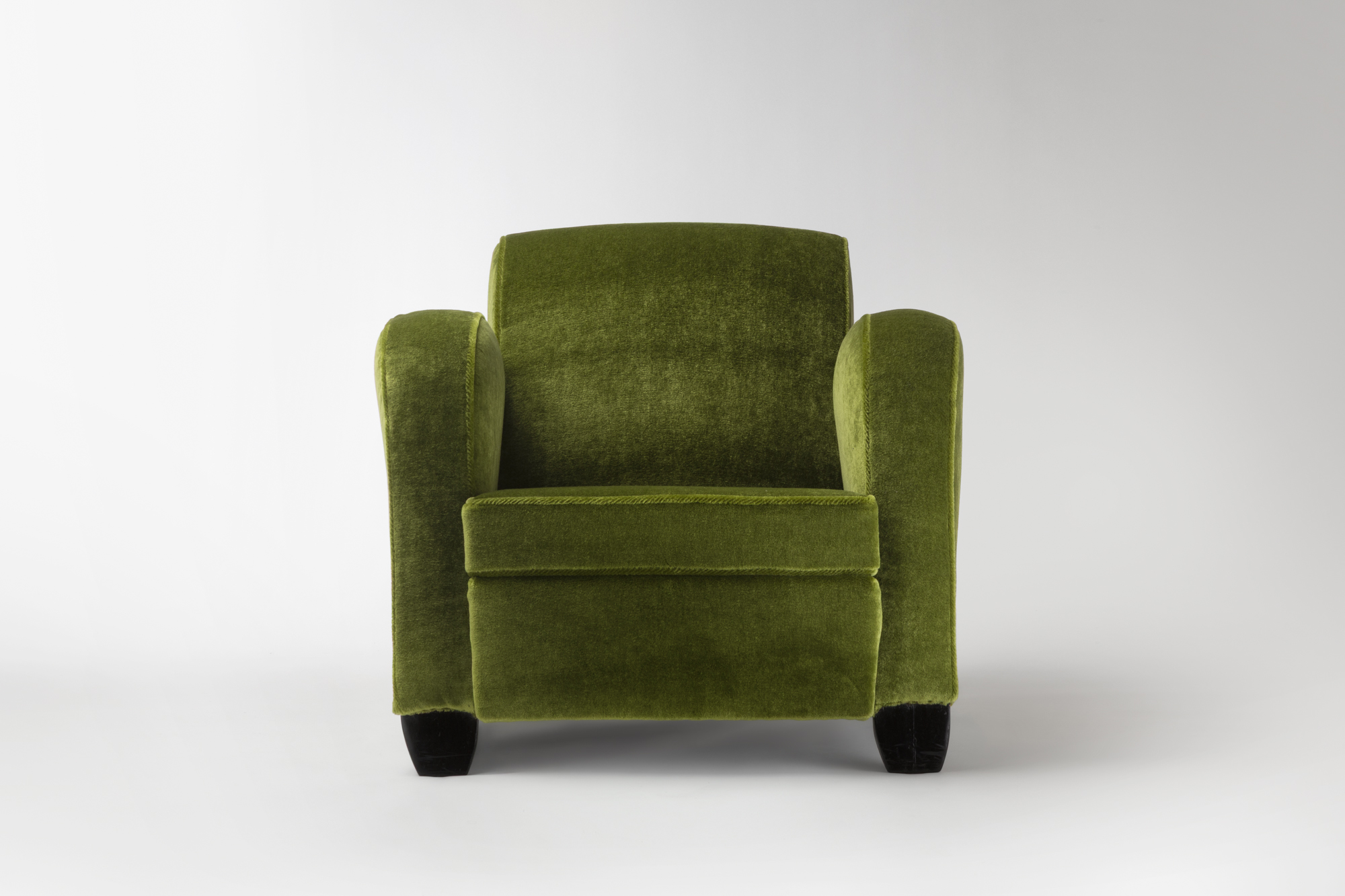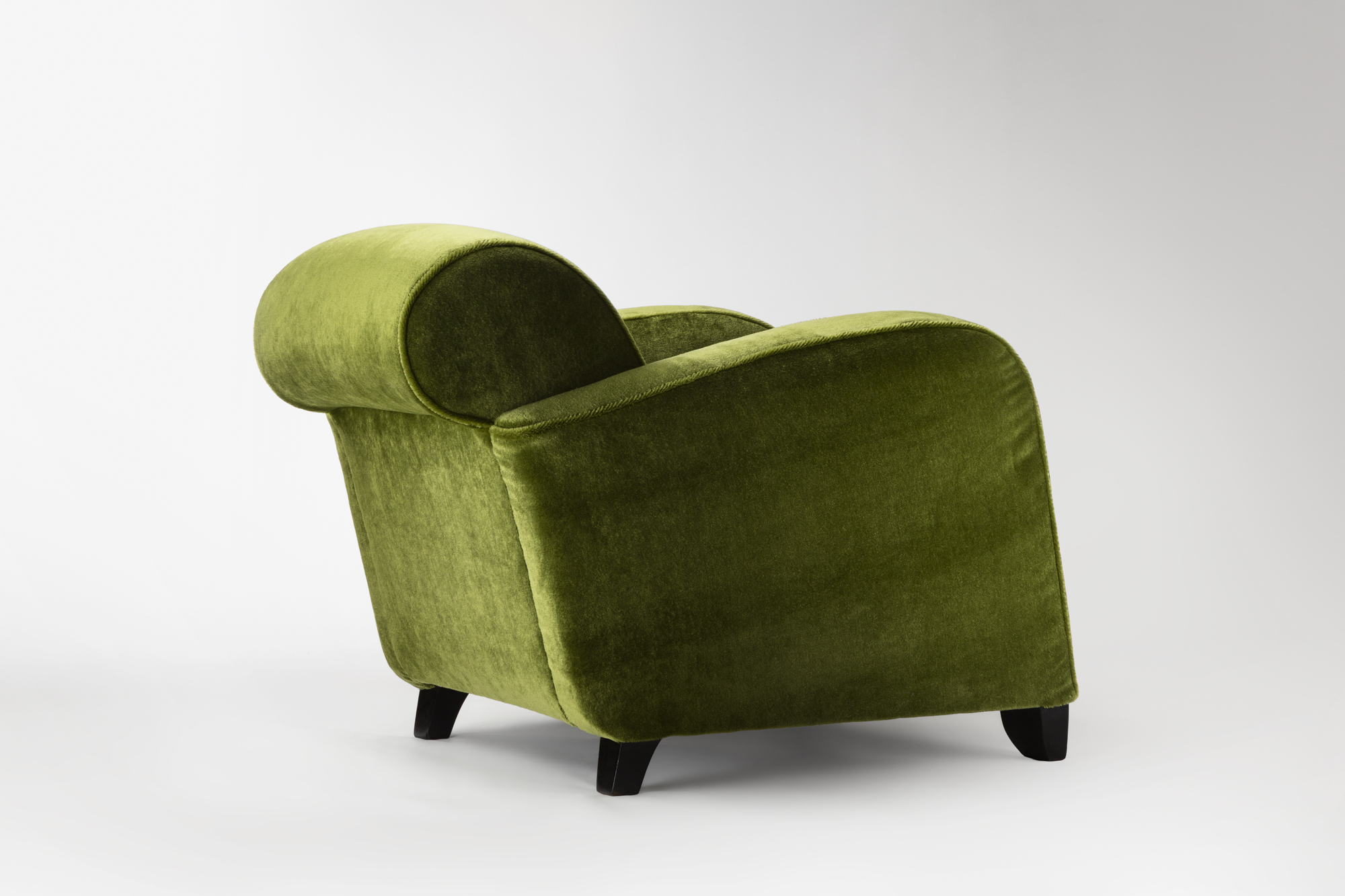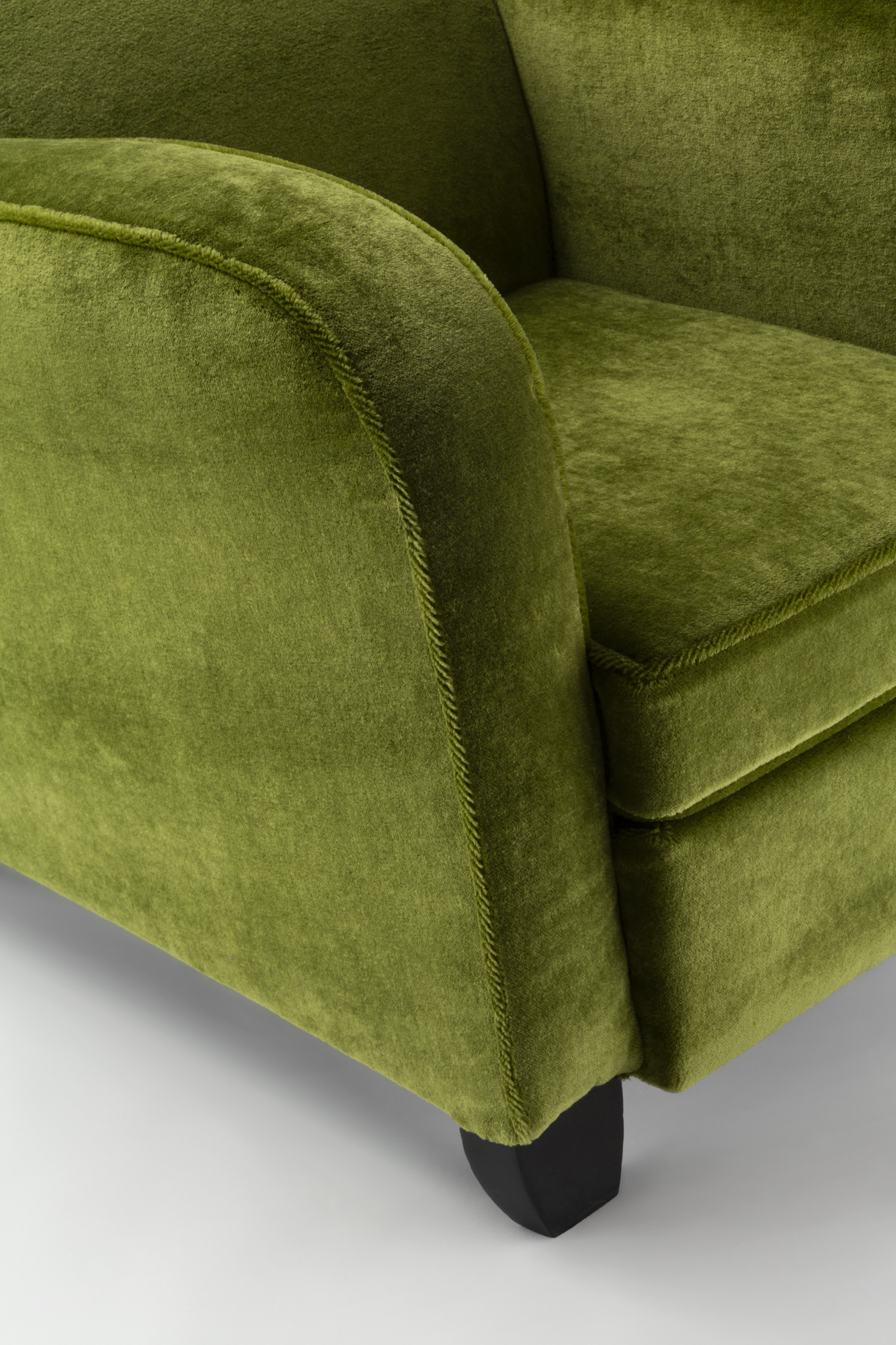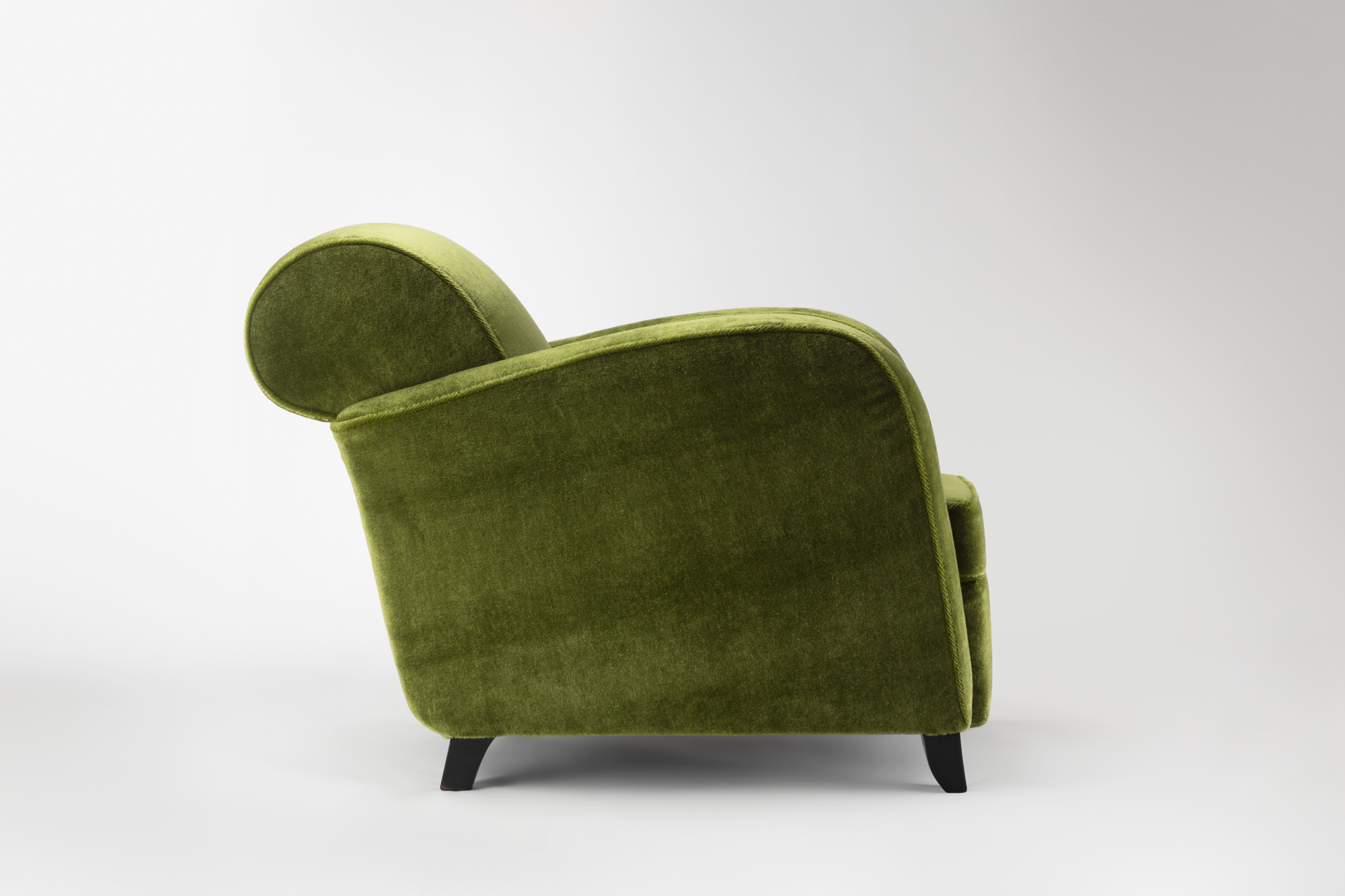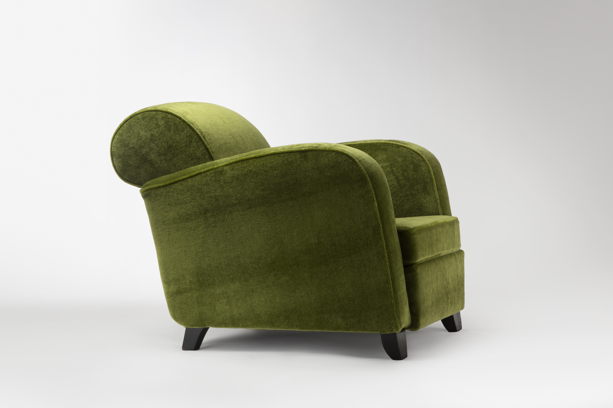Élégante paire de fauteuils signée Jean Desnos, typique des années 1930, avec leurs lignes arrondies, leur assise généreuse et leur revêtement en velours vert. Leur silhouette enveloppante et leur confort en font des pièces raffinées emblématiques du modernisme français.
