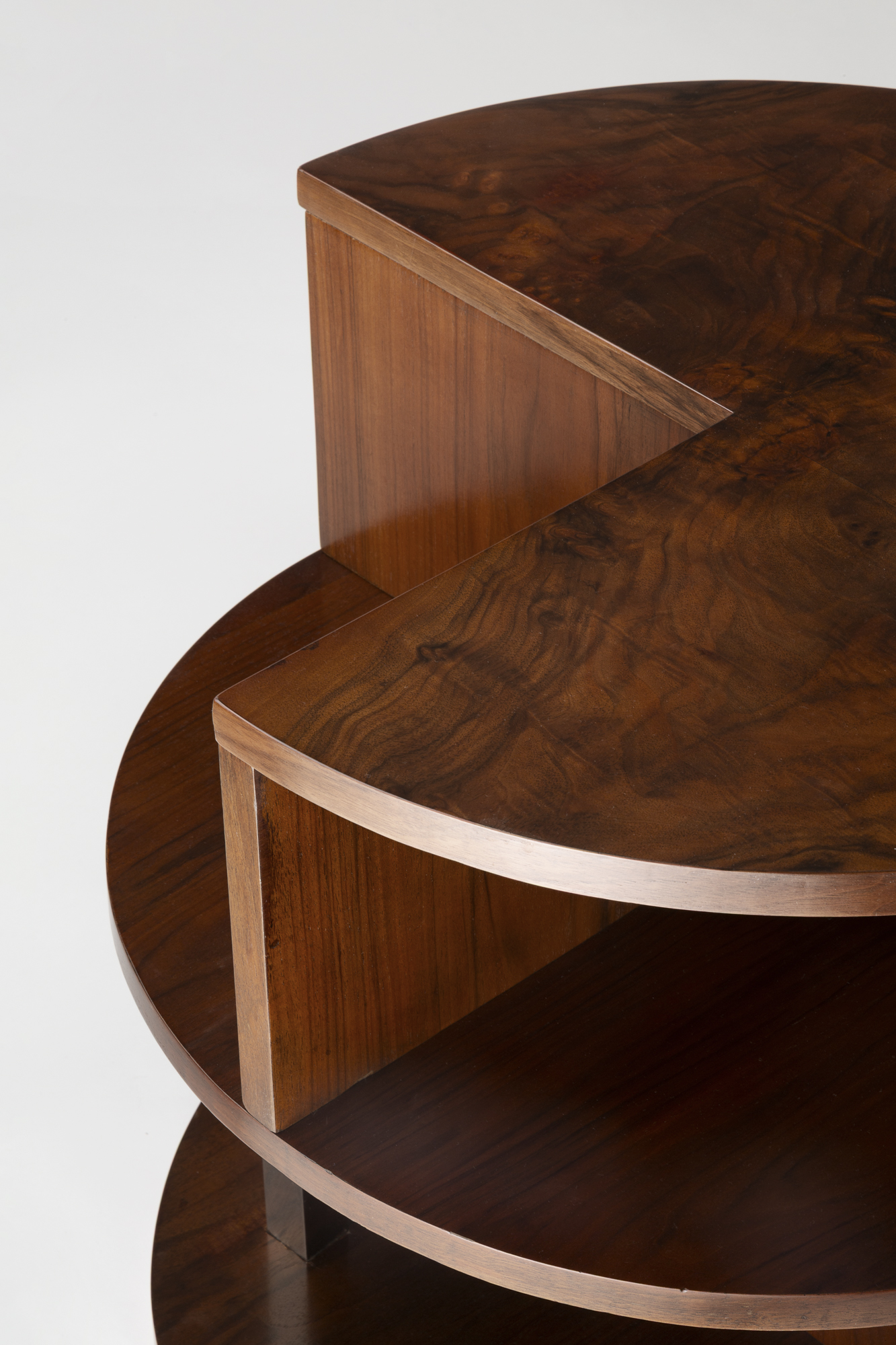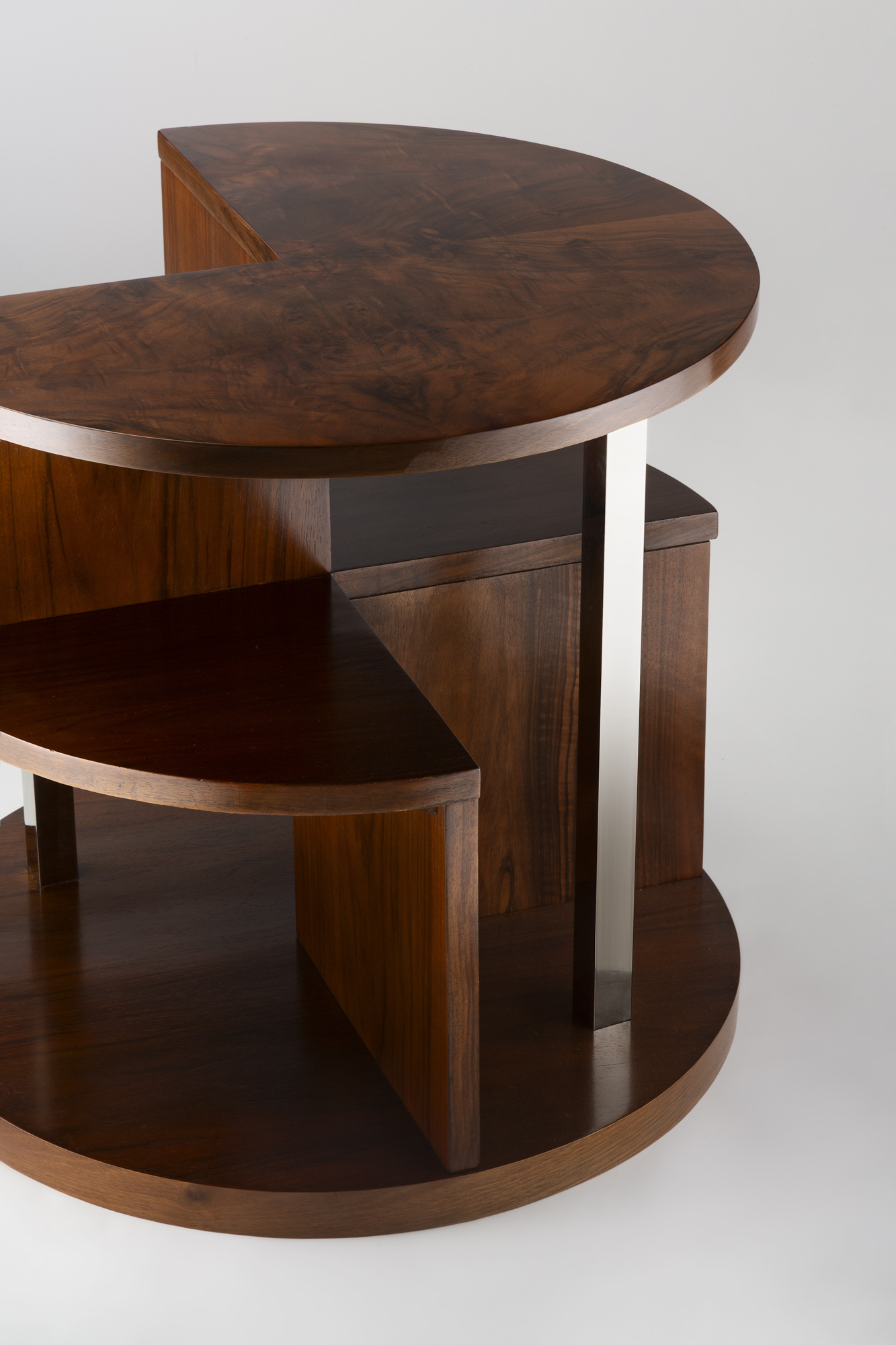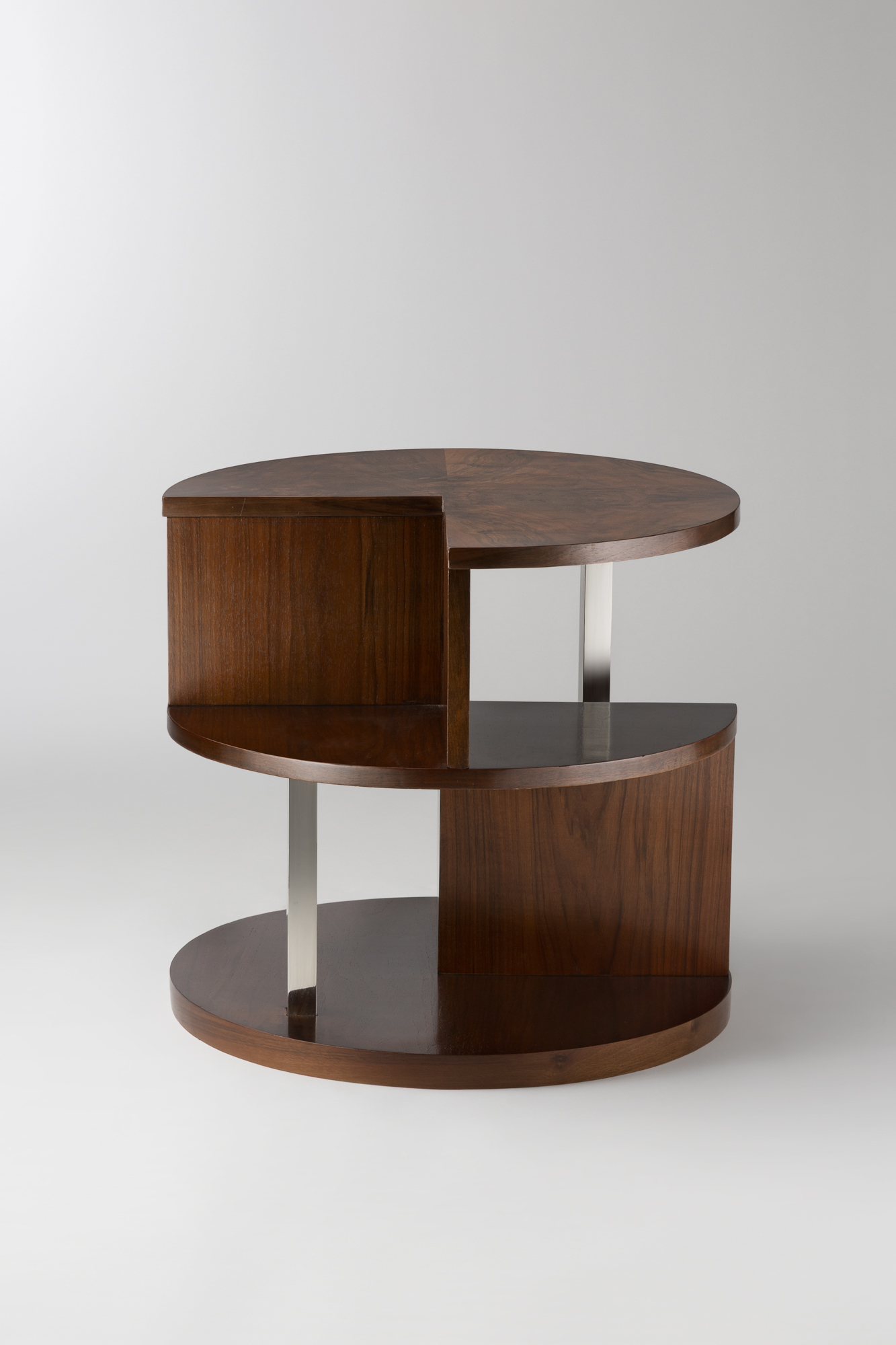 Guéridon moderniste circulaire en placage de noyer et métal chromé.