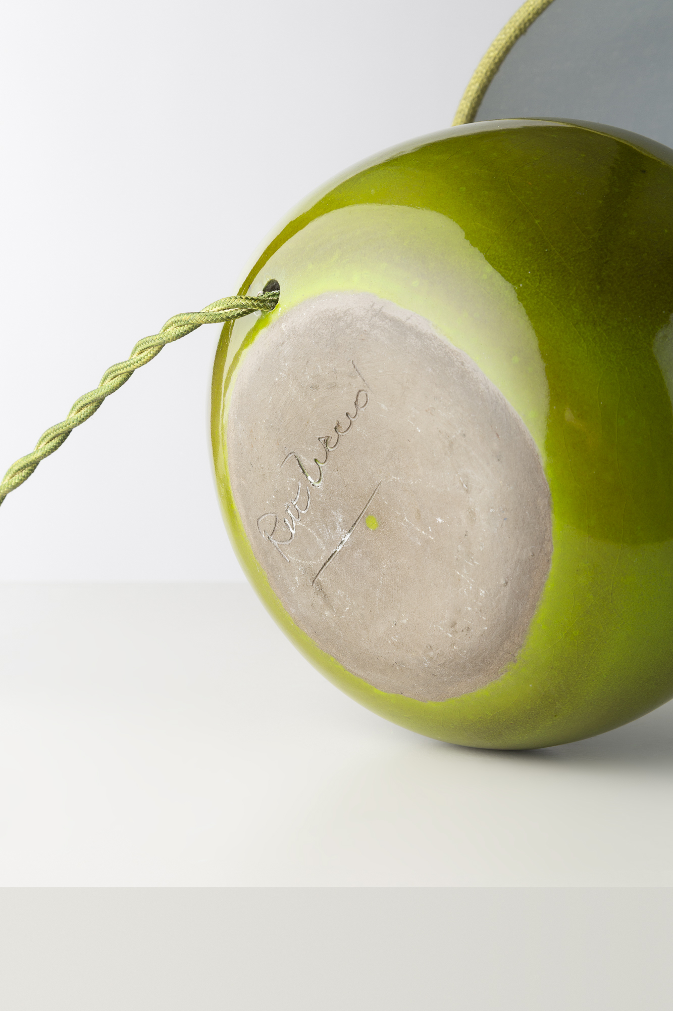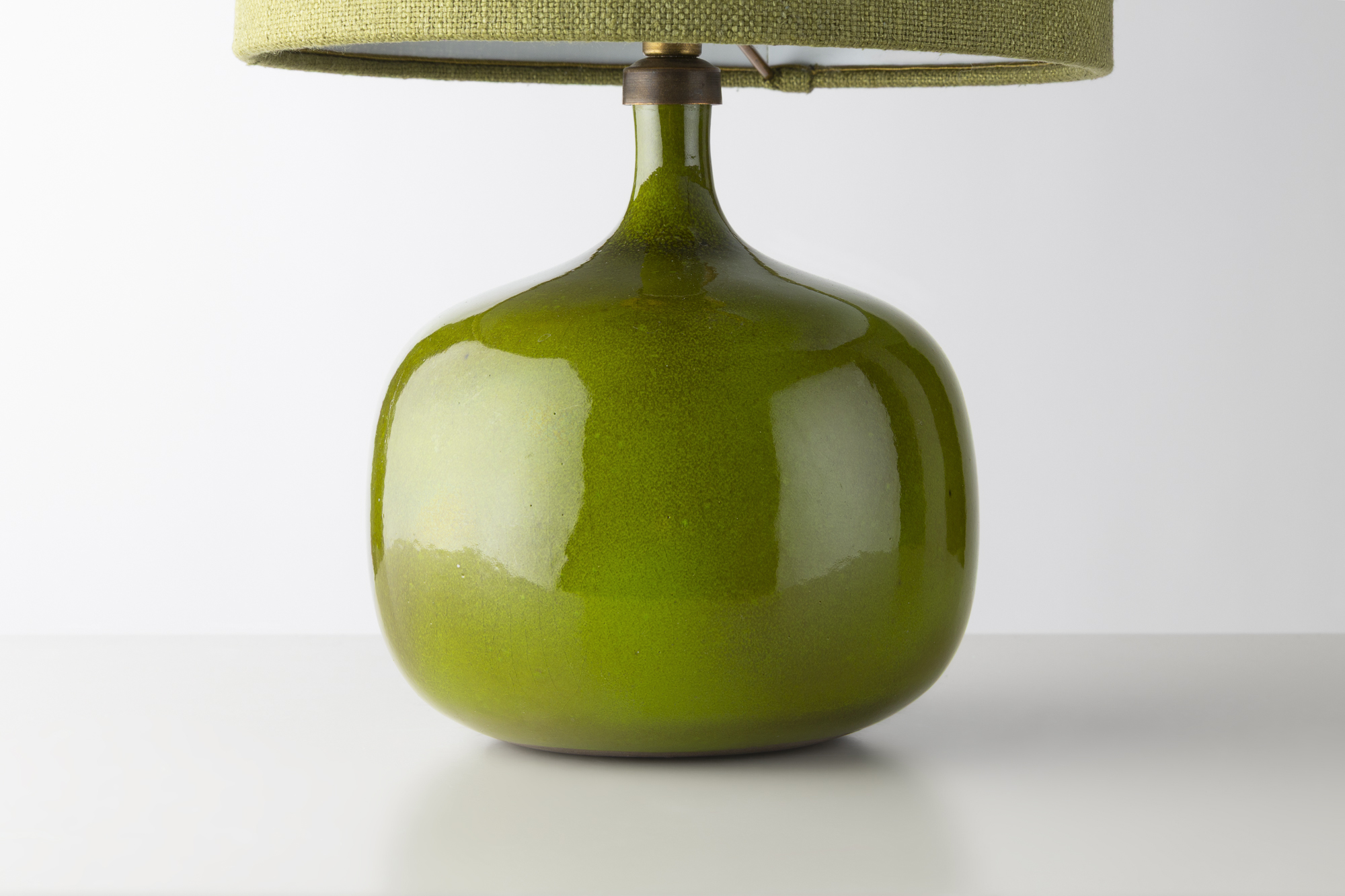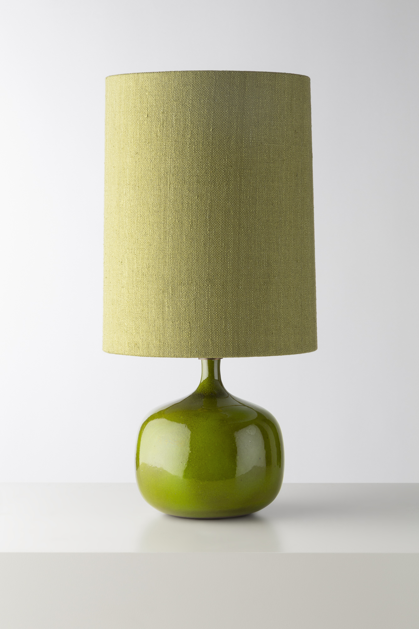Élégante lampe en céramique émaillée, caractéristique du travail des Ruelland, avec son vert profond et lumineux et sa forme douce aux lignes épurées. Son abat-jour assorti souligne l’harmonie des teintes et l’esthétique raffinée propre au duo de céramistes. Une pièce décorative emblématique et intemporelle.