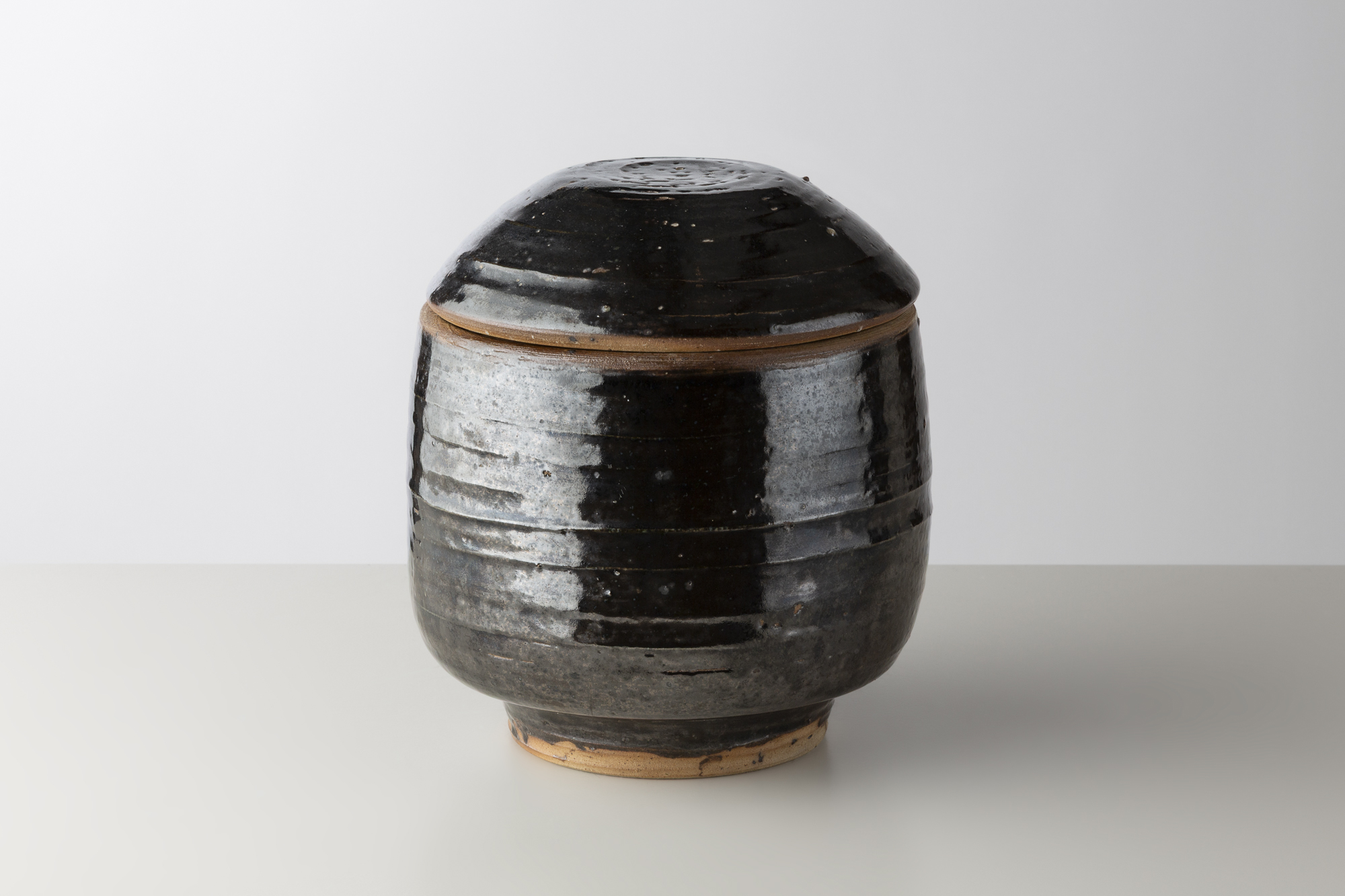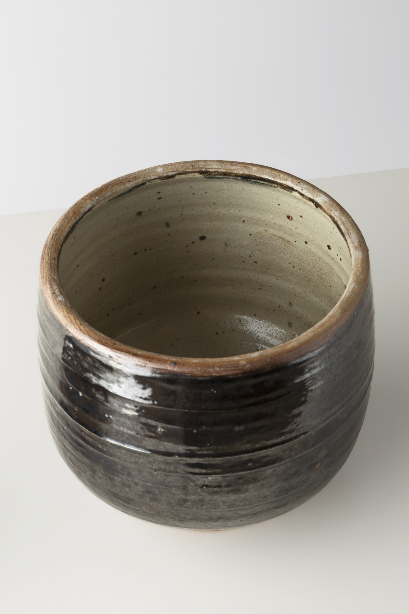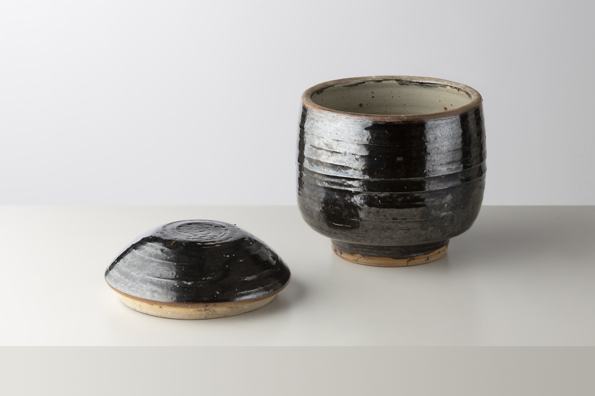 Pot couvert en grès de Michel Lévêque, présenté dans une belle glaçure noire aux nuances profondes et irrégulières. Sa forme généreuse et sa texture vibrante témoignent du savoir-faire du céramiste, mêlant sobriété, puissance matérielle et esthétique intemporelle.