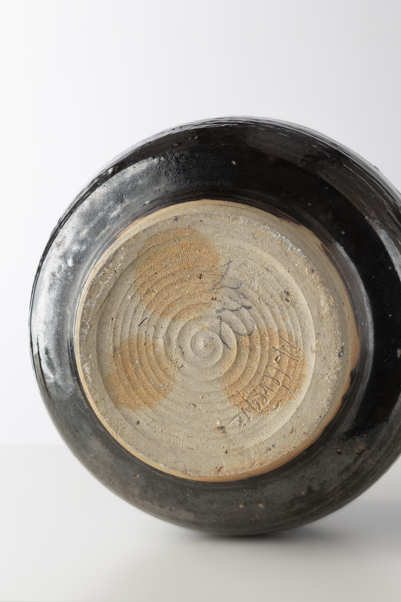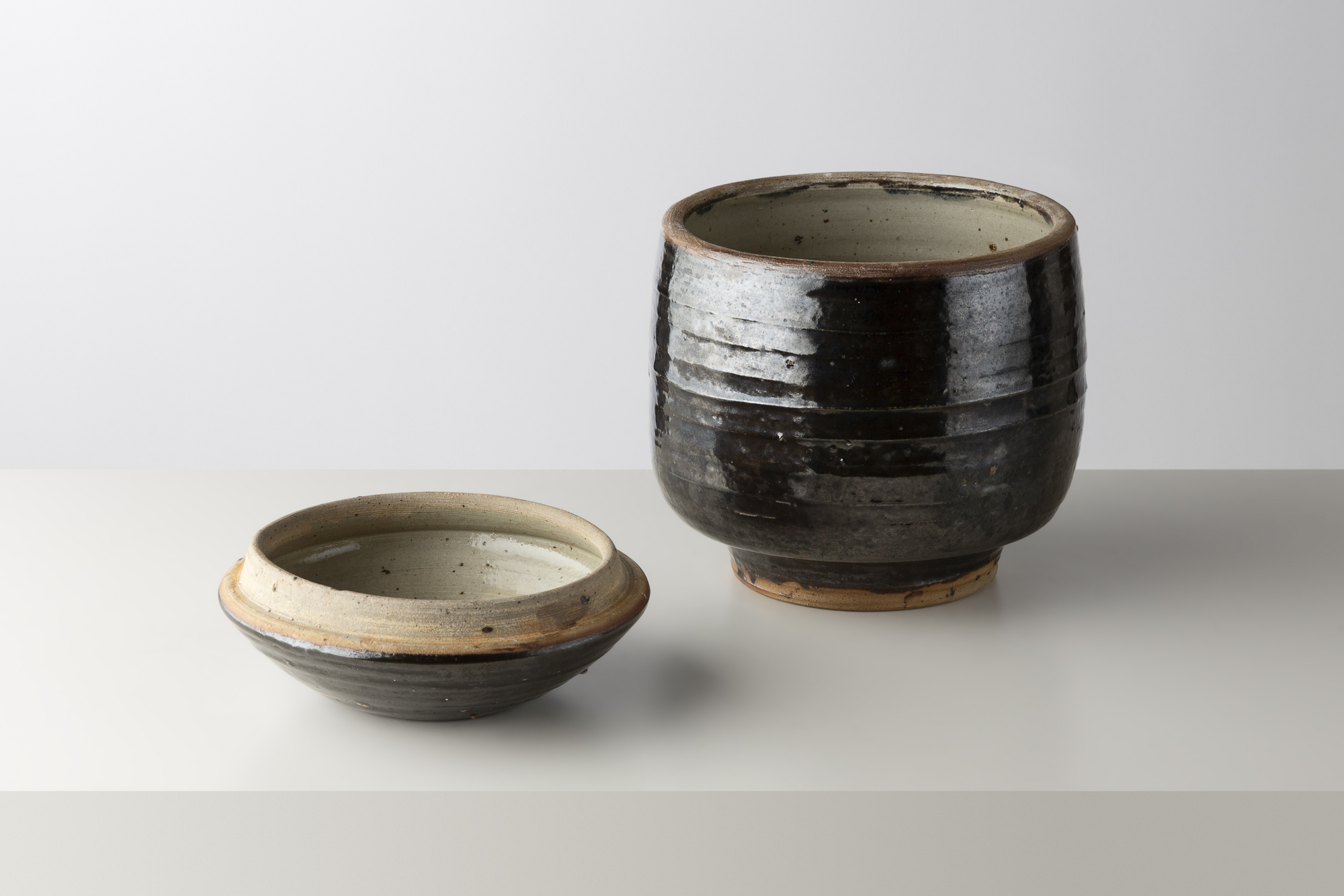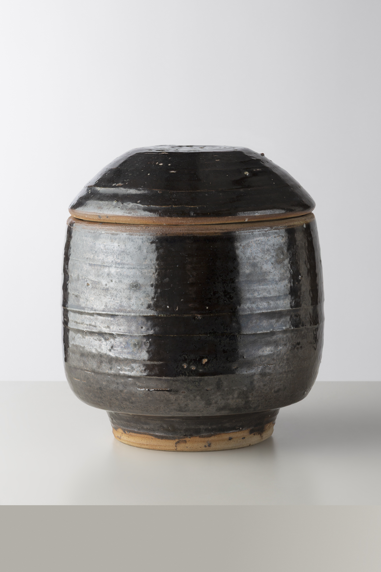 Pot couvert en grès de Michel Lévêque, présenté dans une belle glaçure noire aux nuances profondes et irrégulières. Sa forme généreuse et sa texture vibrante témoignent du savoir-faire du céramiste, mêlant sobriété, puissance matérielle et esthétique intemporelle.