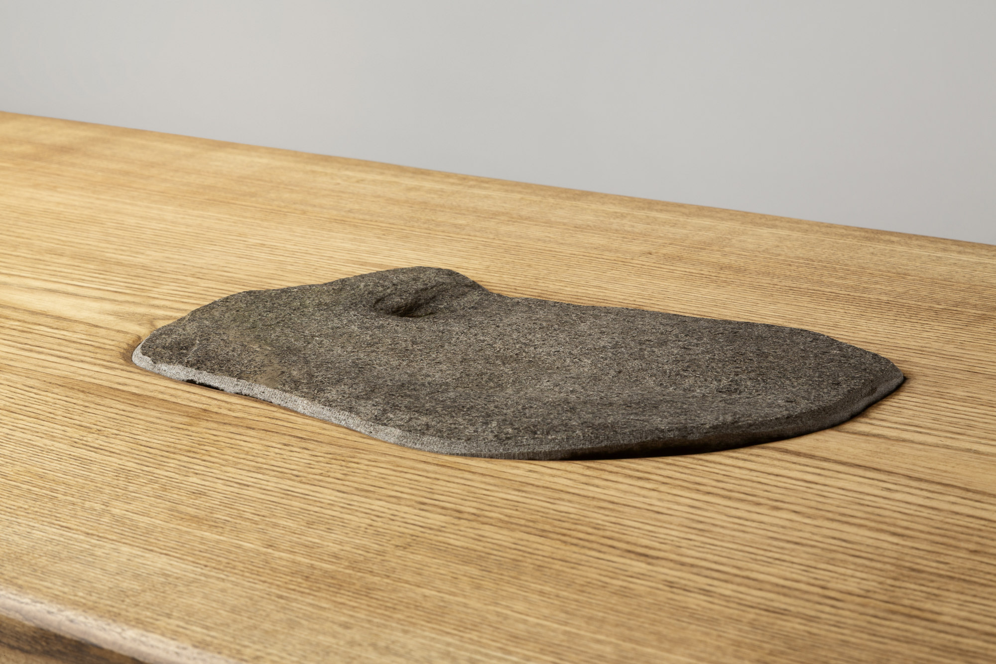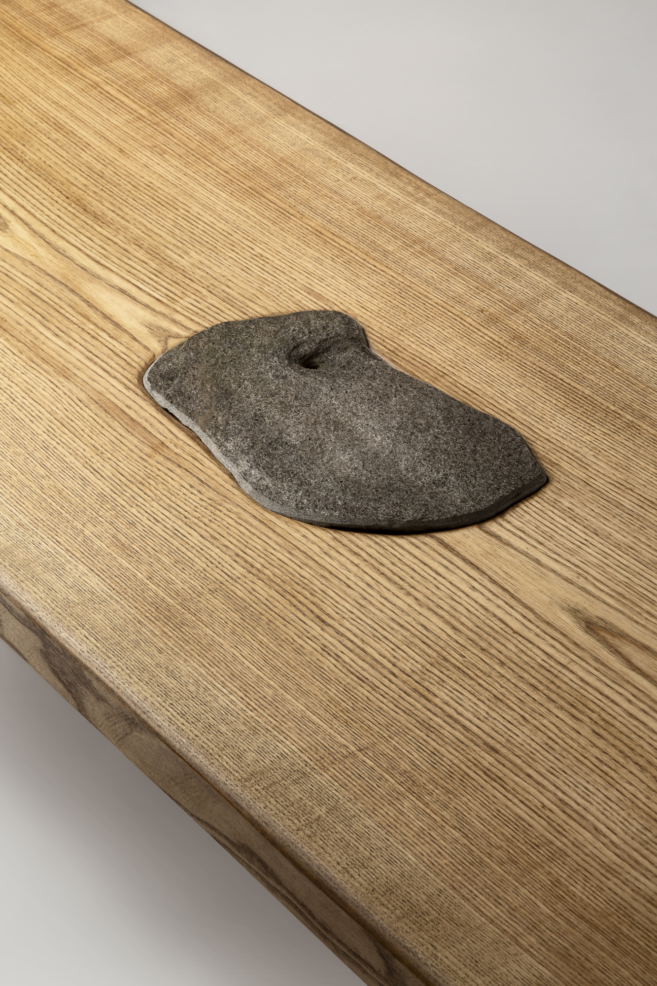 Table basse sculpturale de Matthias Biberon, réalisée en frêne massif et agrémentée d’un insert central en schiste. Ses lignes épurées et son assemblage brut mettent en valeur la beauté naturelle des matériaux, offrant une pièce contemporaine au caractère organique et minéral.