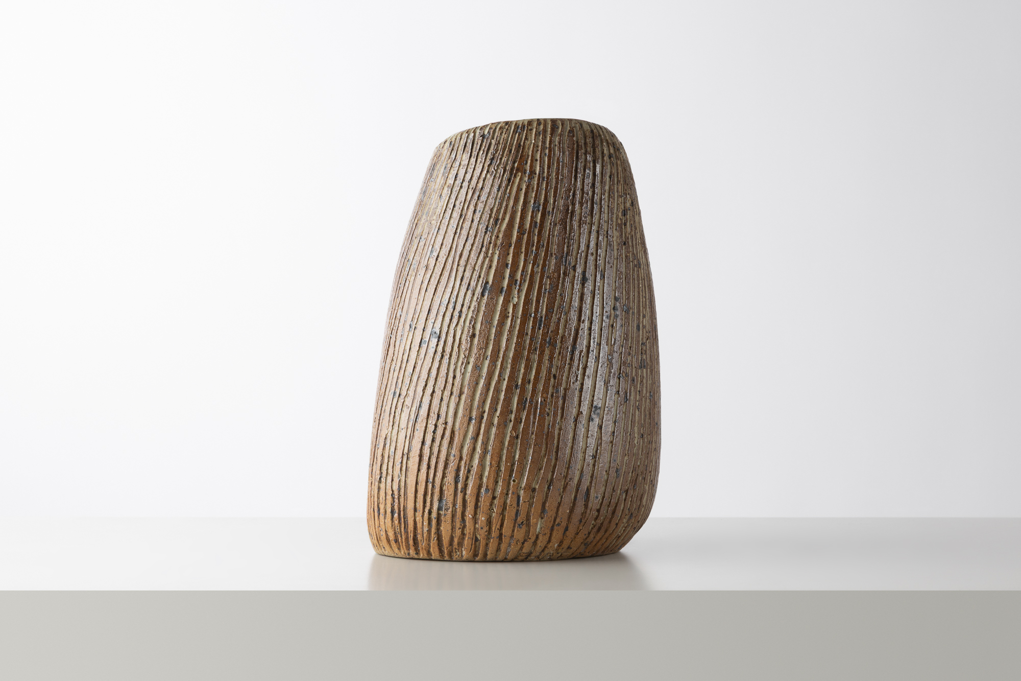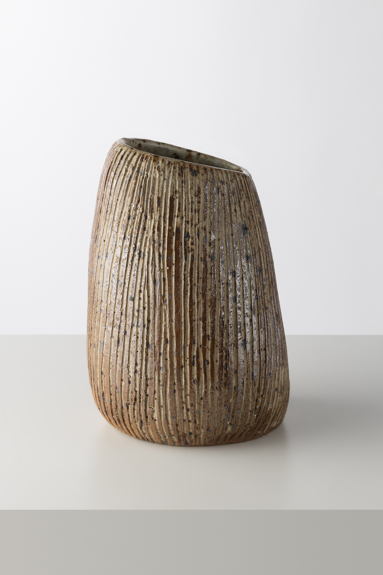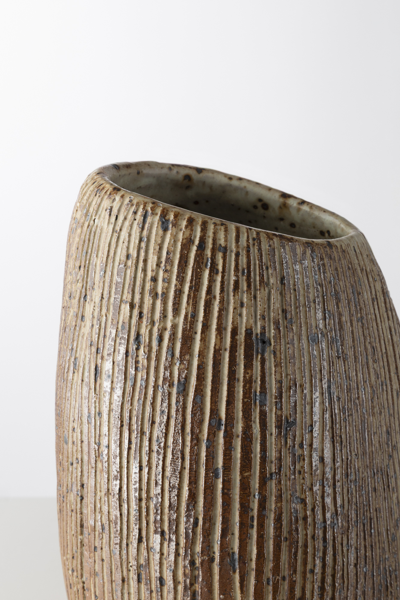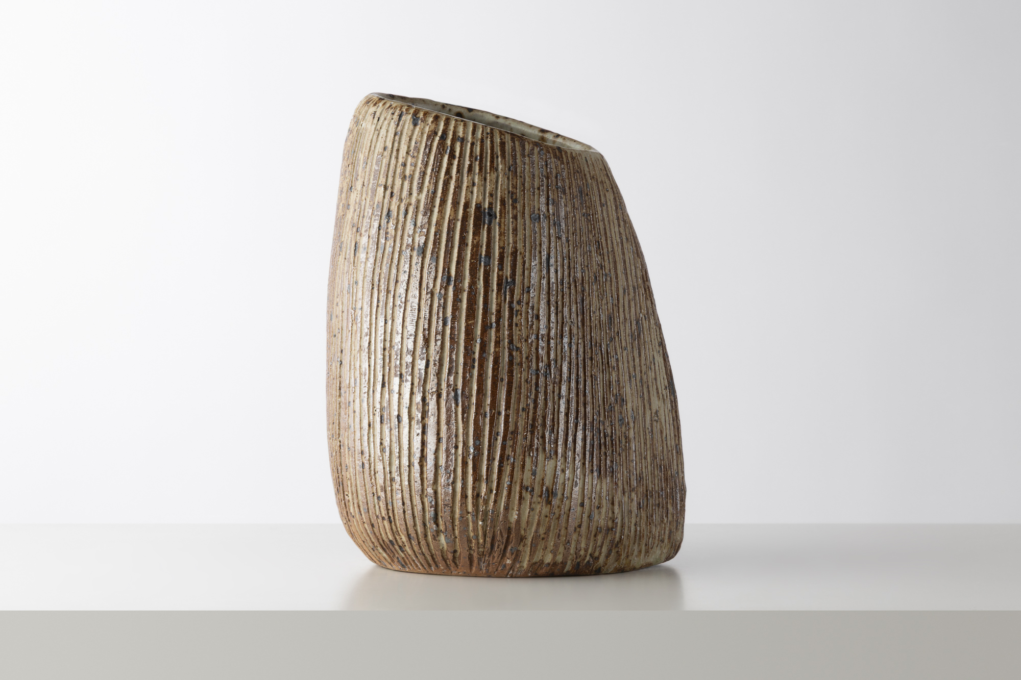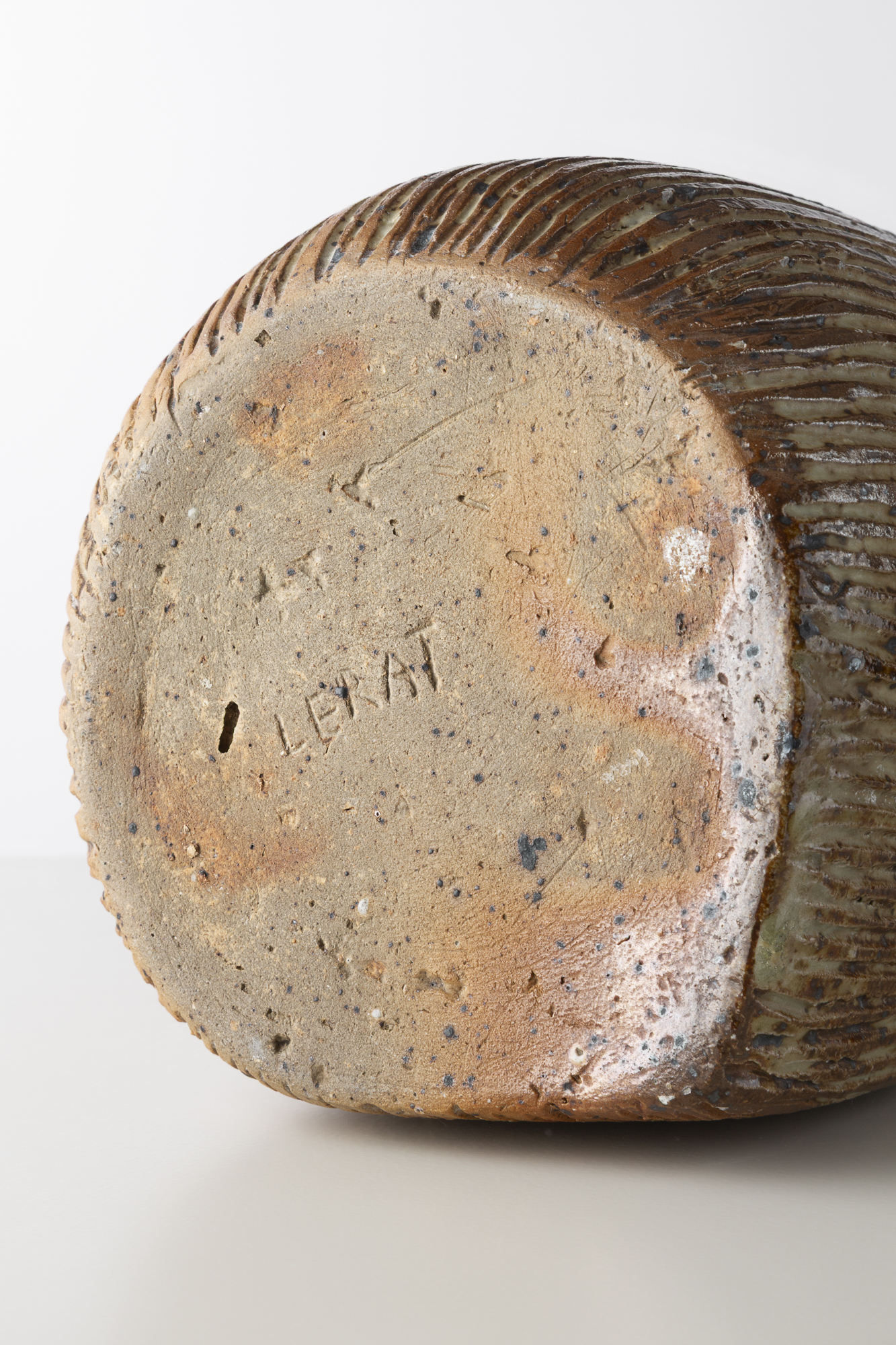 Ce vase en grès signé Jean et Jacqueline Lerat présente une forme tronconique inclinée et une surface fortement scarifiée, révélant la dimension tactile et sculpturale propre au couple de céramistes. Son volume asymétrique, associé à une texture rythmée de stries verticales, confère à la pièce une présence organique et sobre, typique de leur recherche autour de la matière et de l’équilibre des formes.