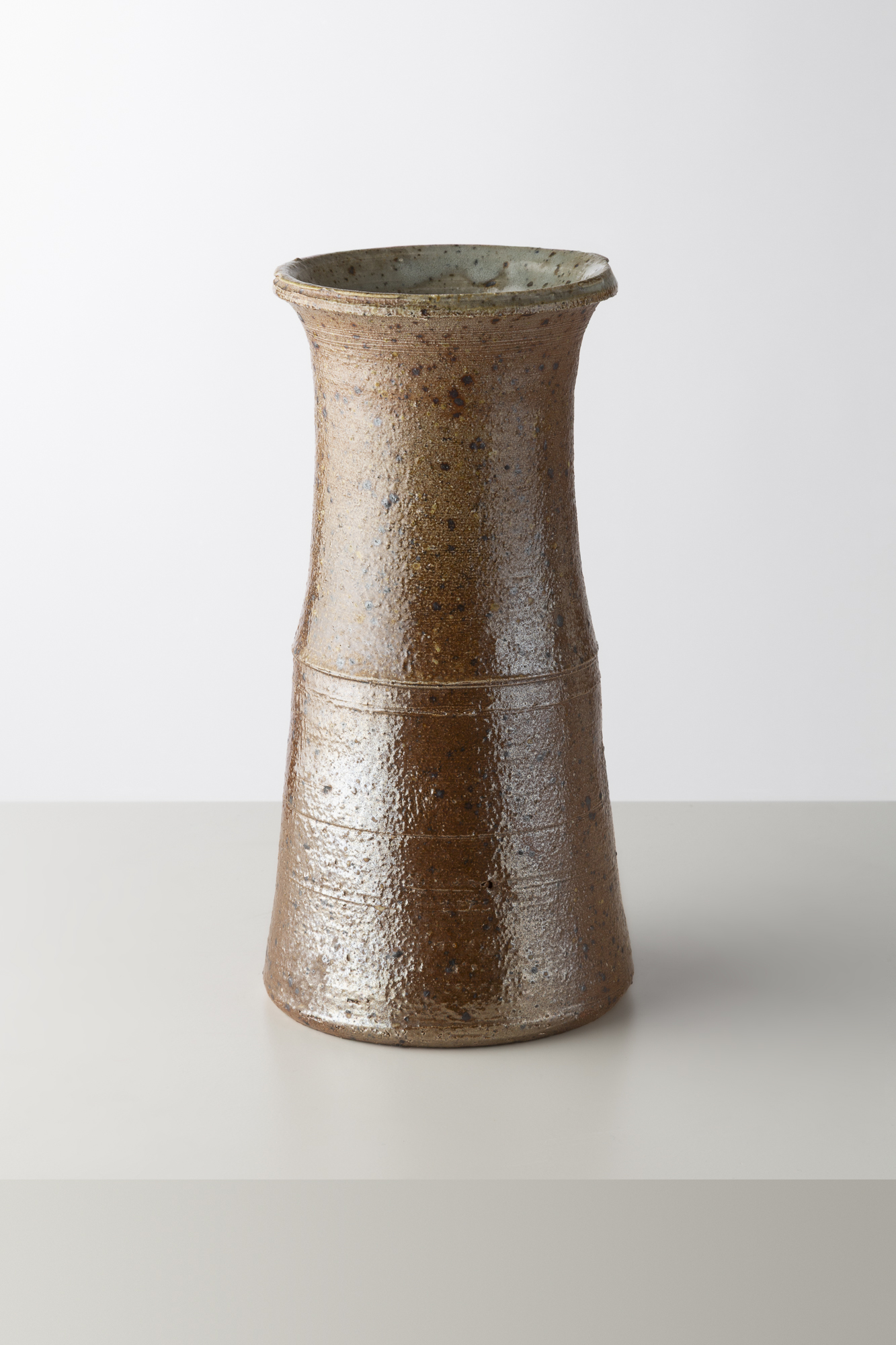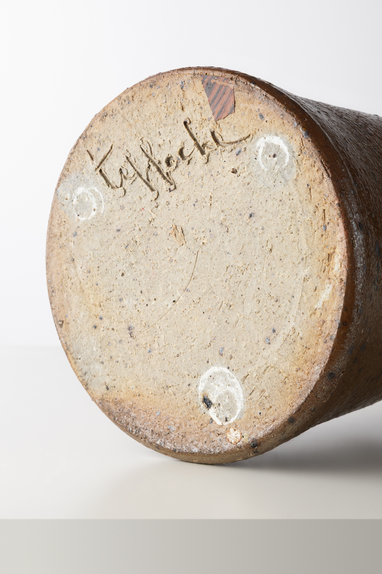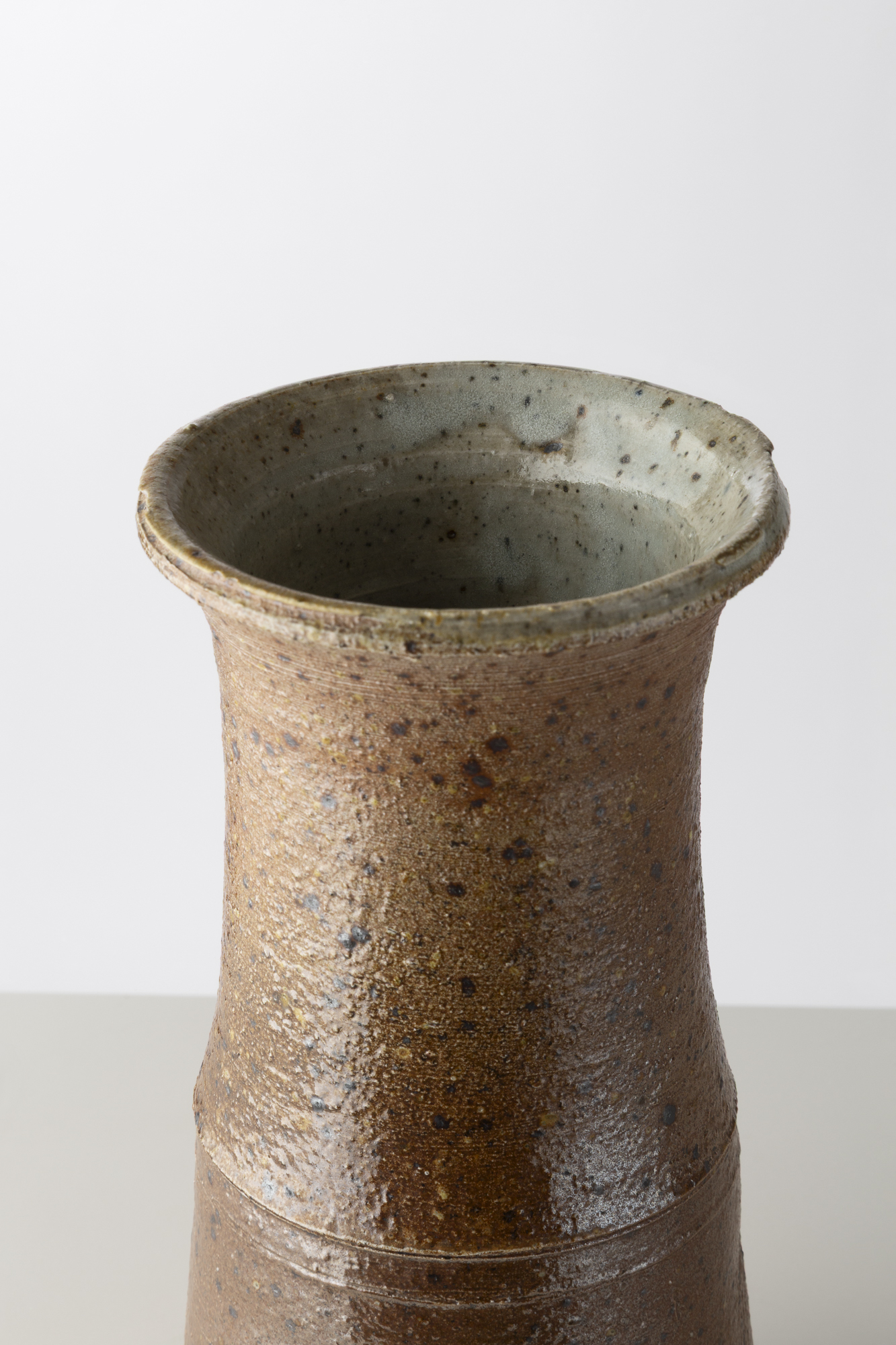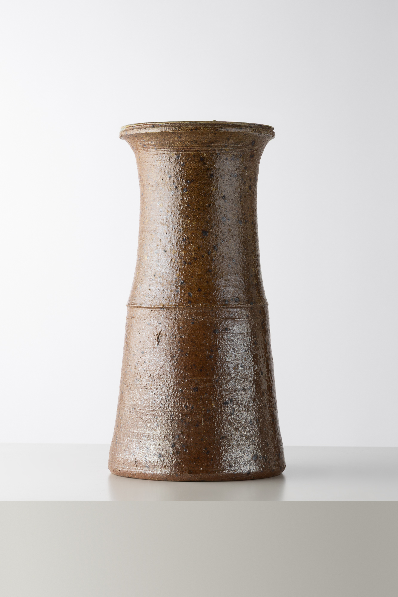 Ce vase tube en grès de Gustave Tiffoche présente une silhouette élancée et légèrement galbée, caractéristique du travail du céramiste. Son émaillage brun moucheté, vibrant de nuances métalliques et terreuses, met en valeur la richesse de la matière et du geste.